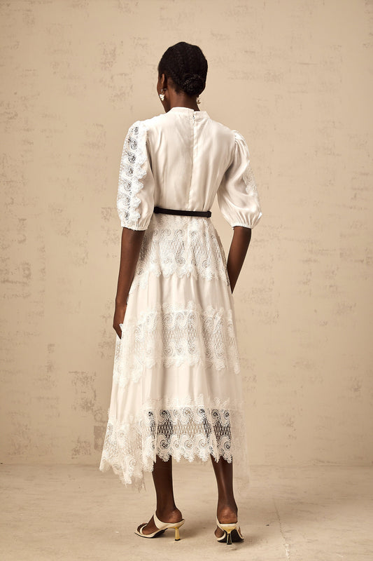 Tamara white belted lace-trim panelled midi dress