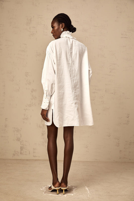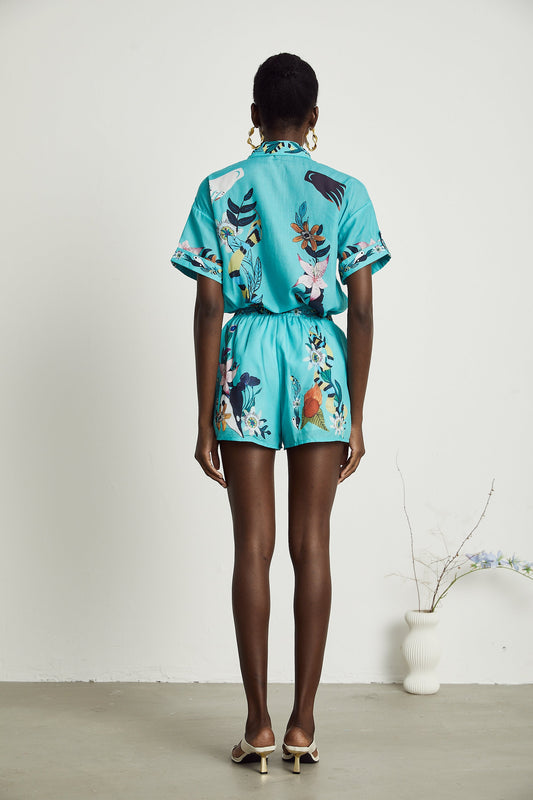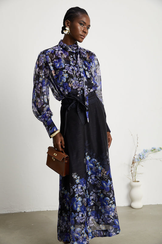 Zoé dark-green ribbon tie-neck shirt & skirt matching set