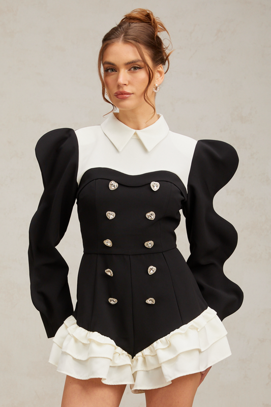 Chloe color-blocked heart-shaped-button ruffled bodysuit