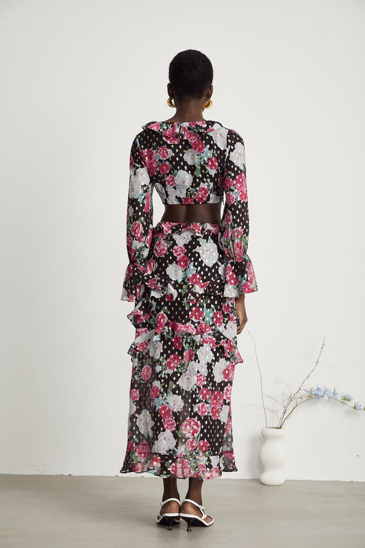 Cloris floral-appliqué ruffled pleated jumpsuit