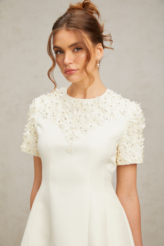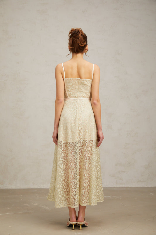Anastasia floral-embroidered lace ruffled bustier midi dress