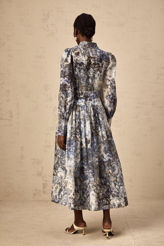 Olena blue ruffled floral-lace trimmed tiered midi dress
