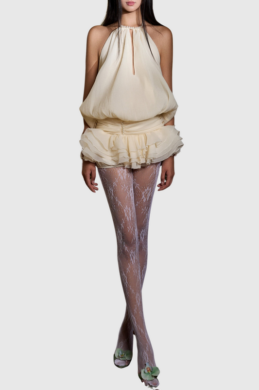 Gaiwan Halter Pearl Ruffle Mini Dress