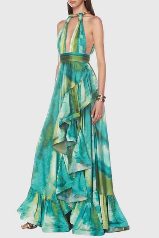 Thata Halter Printed Cutout Ruffle Maxi Dress