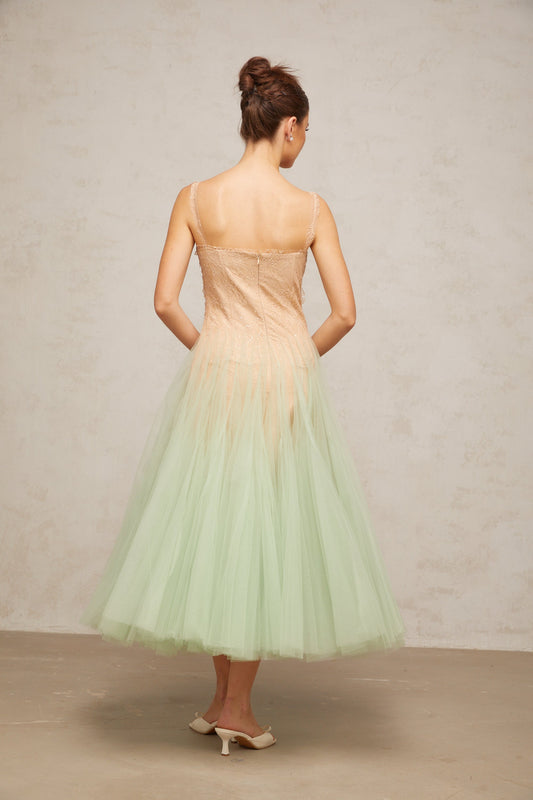 Zoéline green lace-panelling tulle midi dress