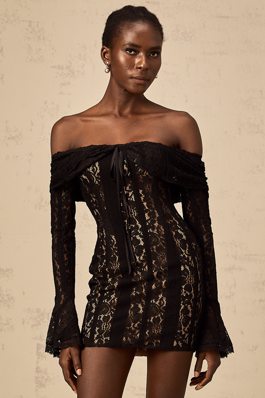 Émeline floral lace flared-cuff mini dress in Black