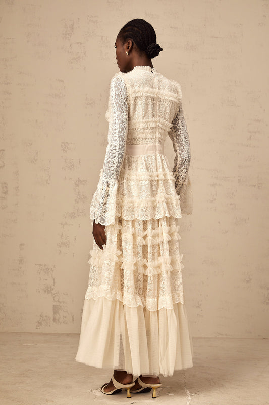 Agnès neutrals lace-panel ruffled tulle maxi dress