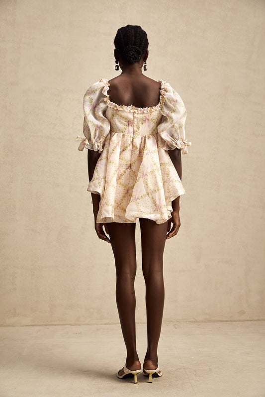 Émeline floral lace flared-cuff mini dress in Neutrals
