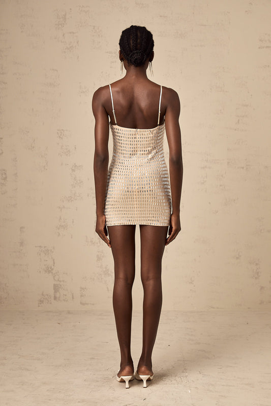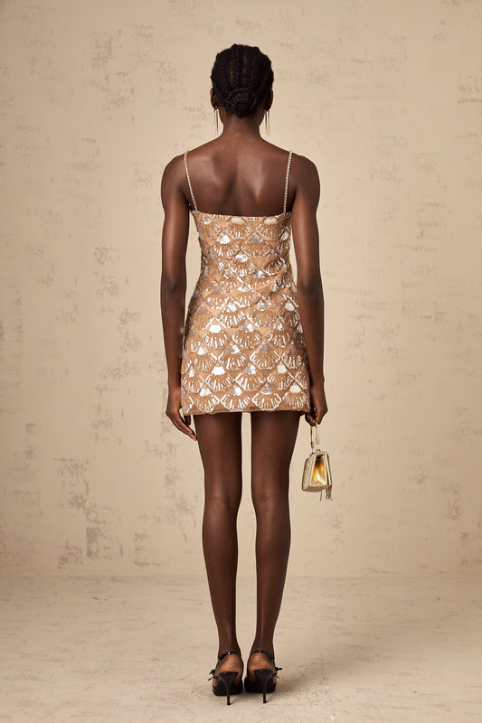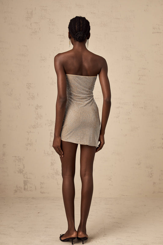 Mélissa crystal-embellished long-sleeved mini dress in Neutrals