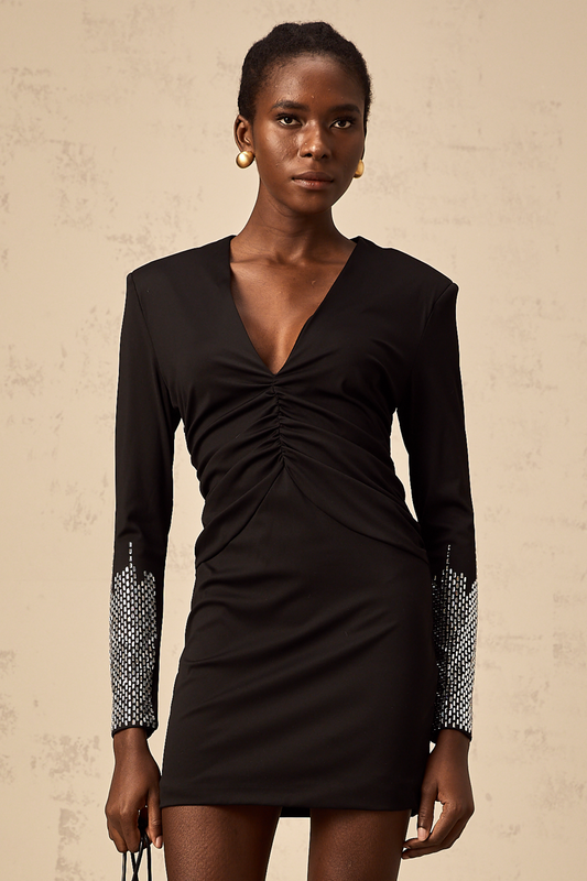 Suzy black rhinestone gathered mini dress