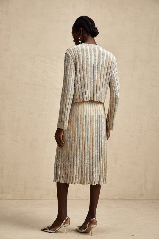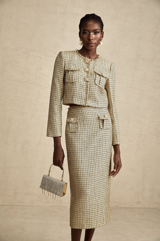 Elisabeth beige crystal tweed cardigan & skirt matching set
