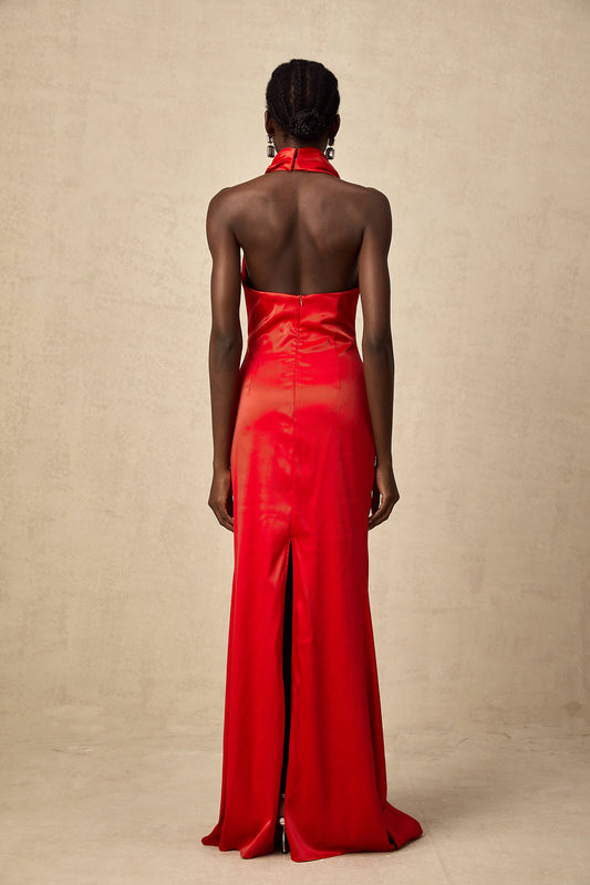 Alix red halterneck draped satin maxi dress