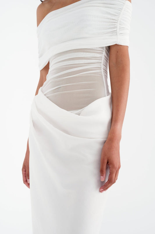 Reanko Off Shoulder Ruched Mesh Maxi Dress - White