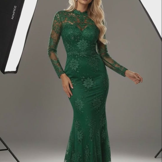 The fitted mermaid silhouette sculpts the figure, while the delicate lace long sleeves and high neckline bring a graceful, regal presence. A flowing hem completes the look, making it perfect for gala evenings, pageants, red-carpet events, or any occasion that calls for timeless glamour.