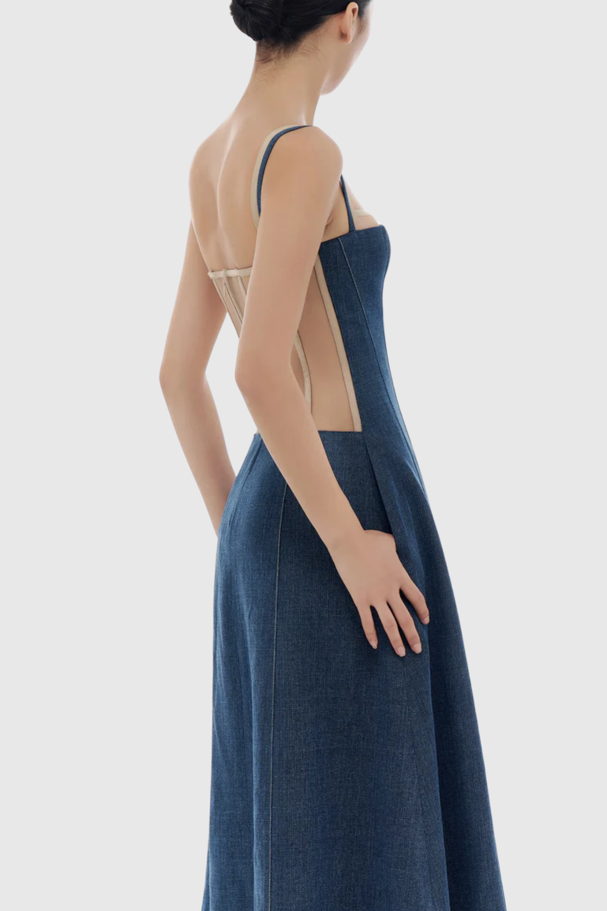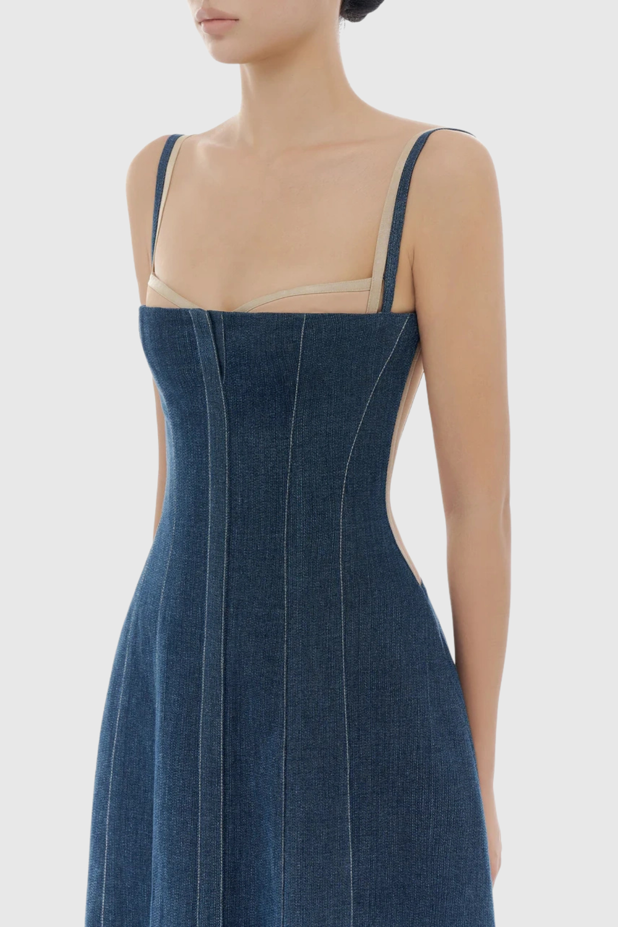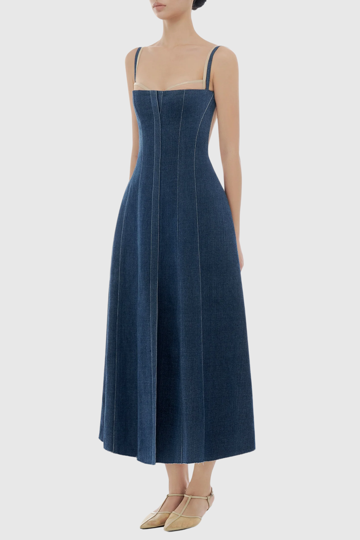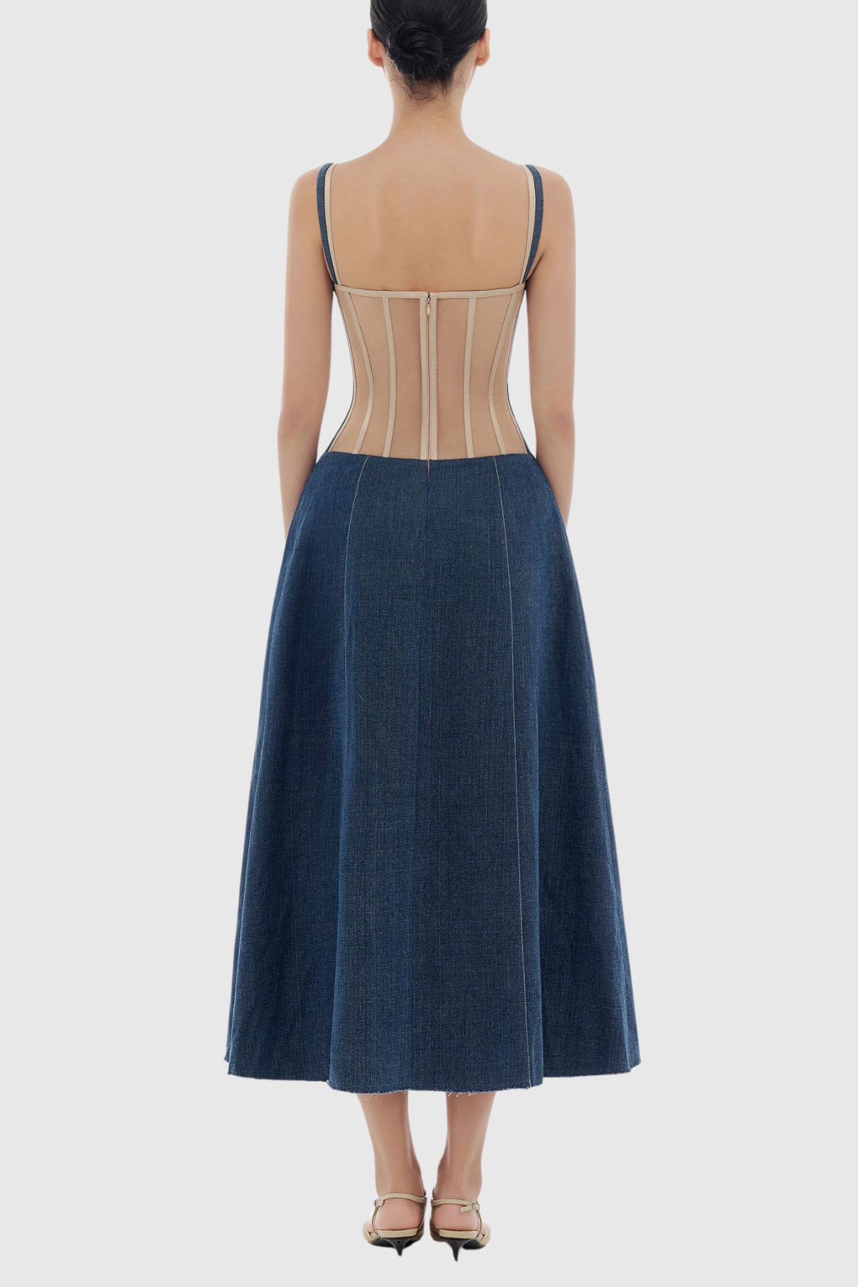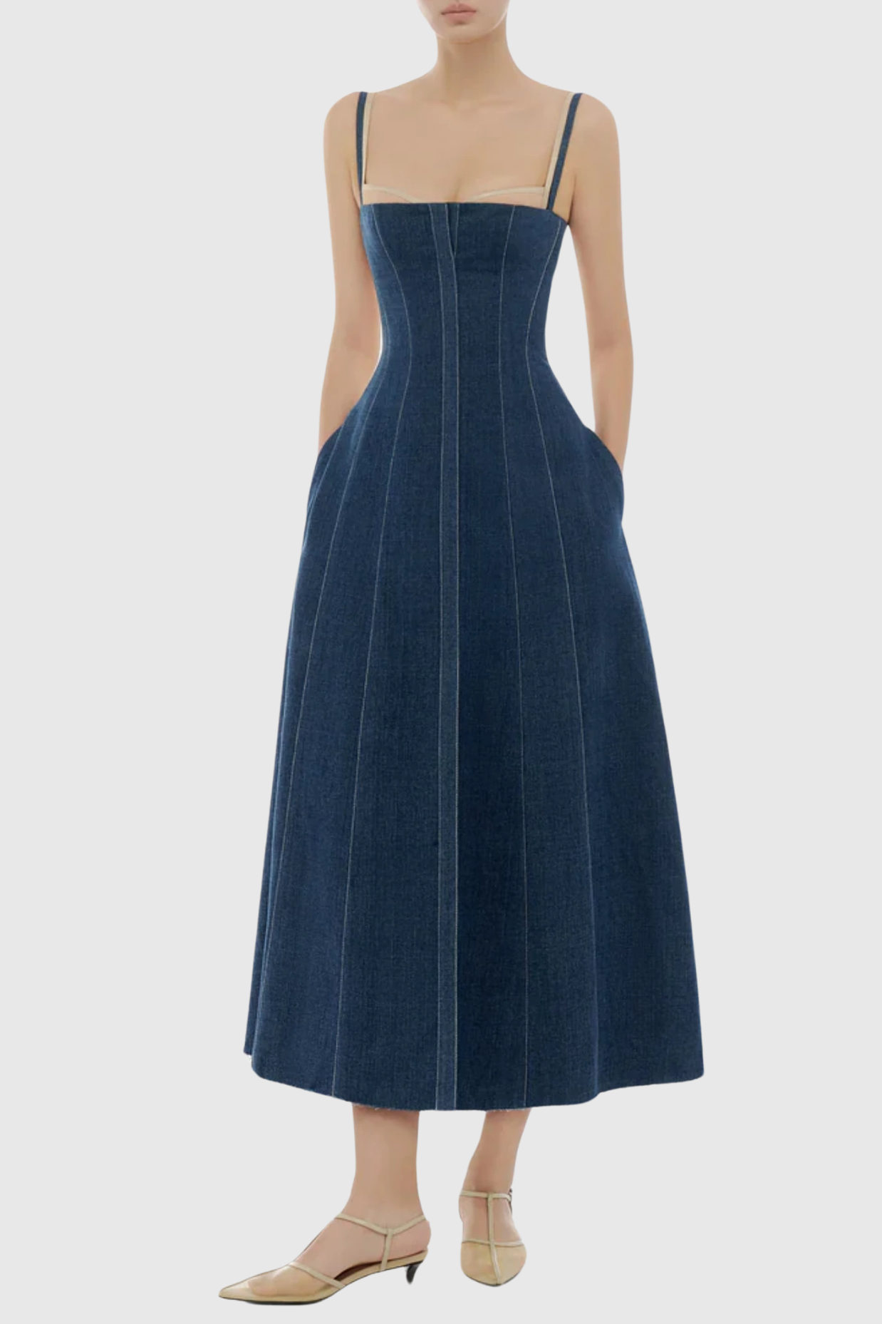 Elevate your wardrobe with the luxurious Abeje Corset Denim Midi Dress. Made with high-quality denim, this dress features a corset style bodice for a figure-flattering fit. The midi length adds sophistication while the denim material adds a touch of edge. Perfect for a day out or a special occasion.