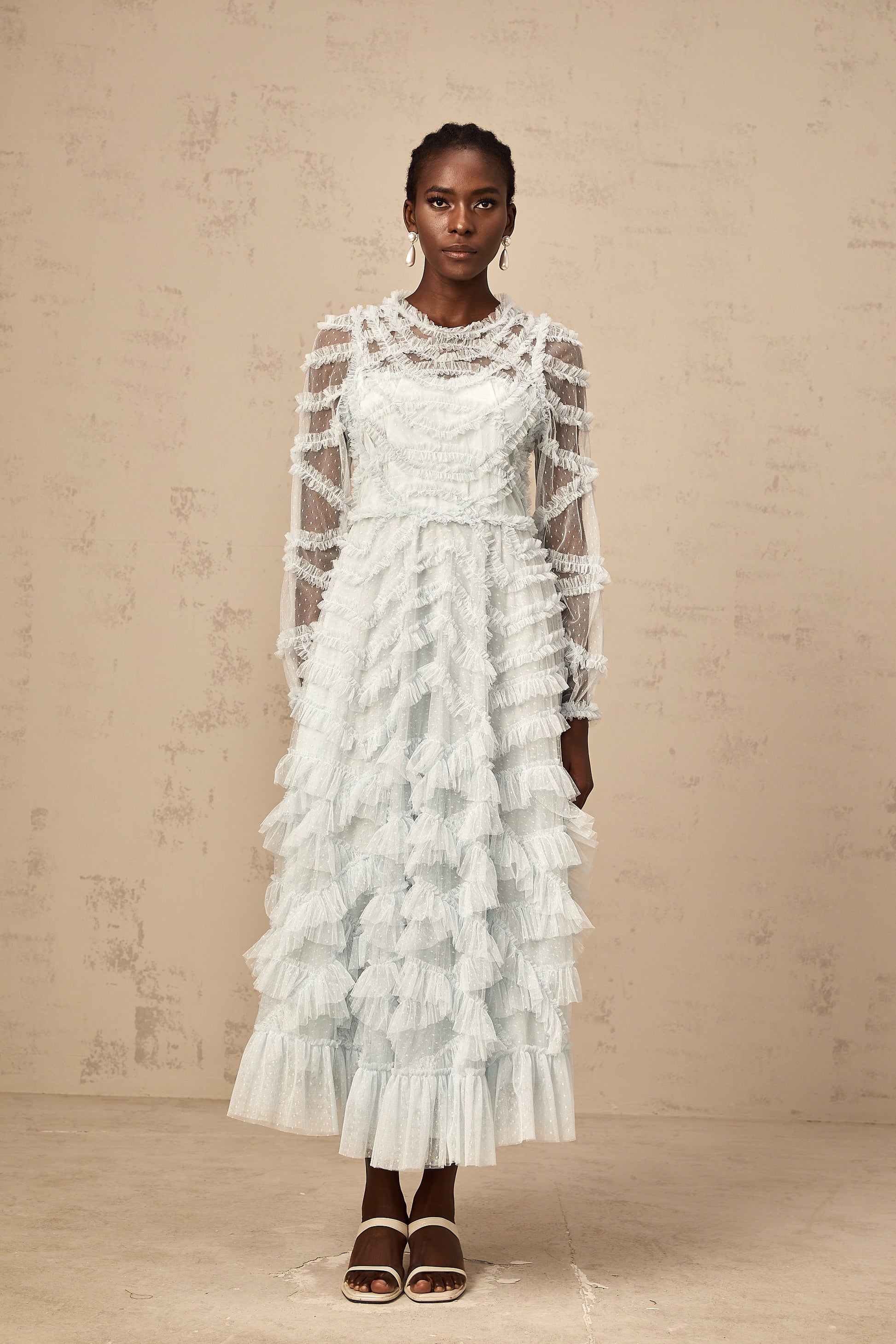 • Long semi-sheer sleeves