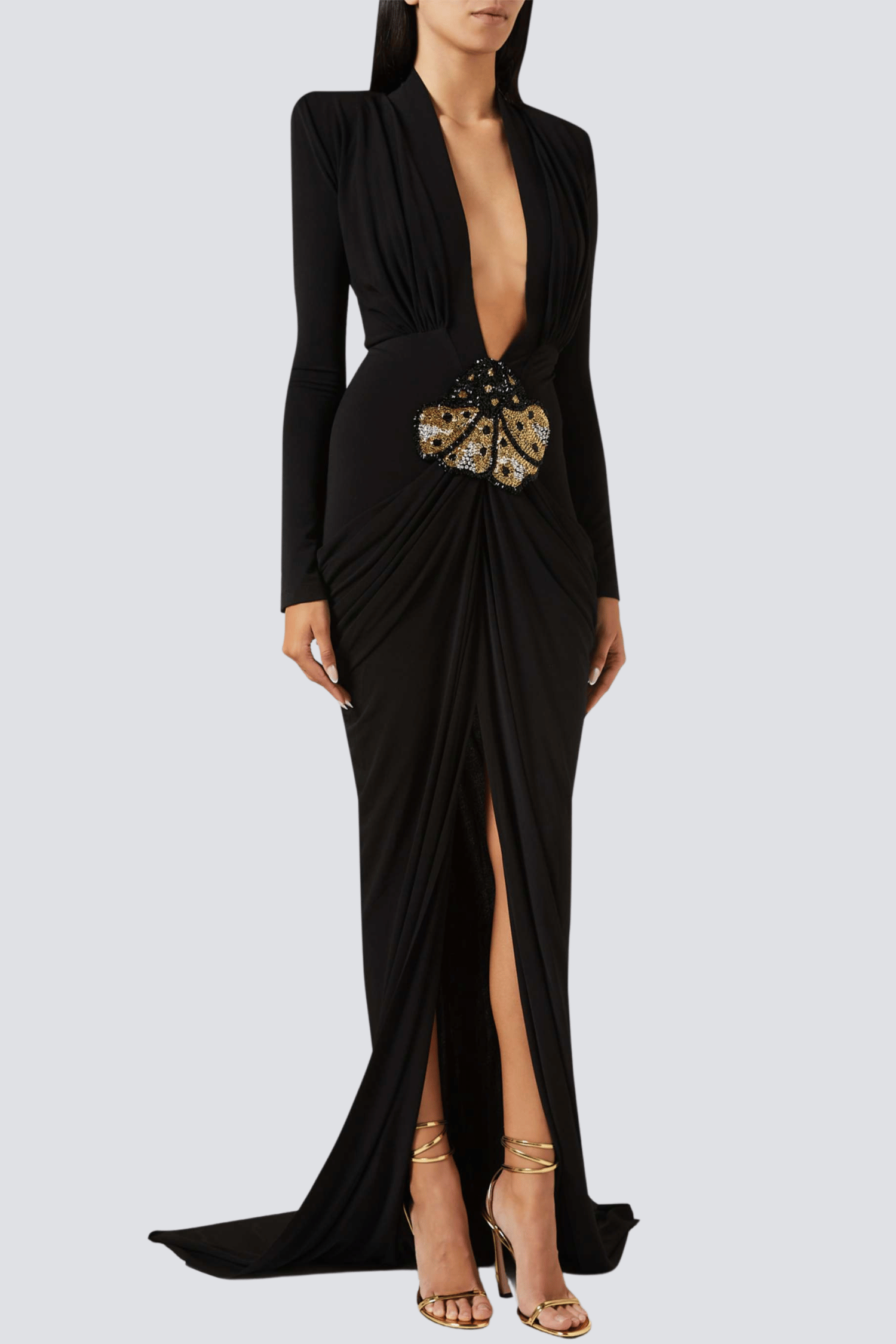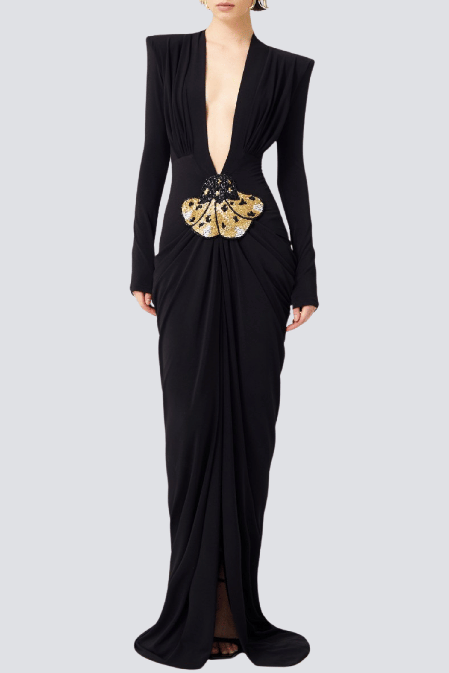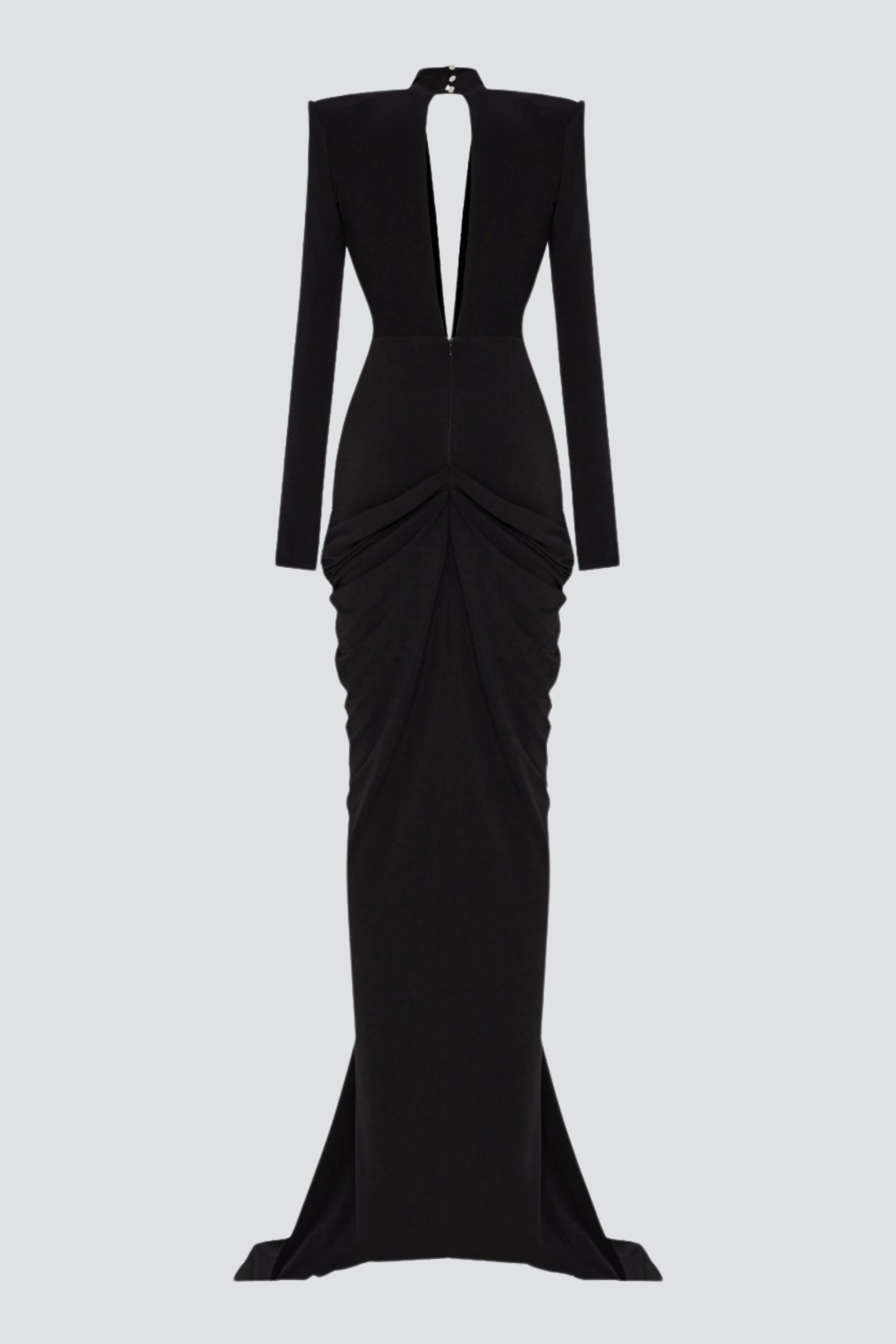 Upgrade your wardrobe with the Agata V-neck Ruched Maxi Dress. This elegant and exclusive dress features a flattering V-neckline and ruched details that enhance your curves. With its luxurious fabric and versatile design, this dress is perfect for any occasion. Elevate your style and make a statement with the Agata Maxi Dress.