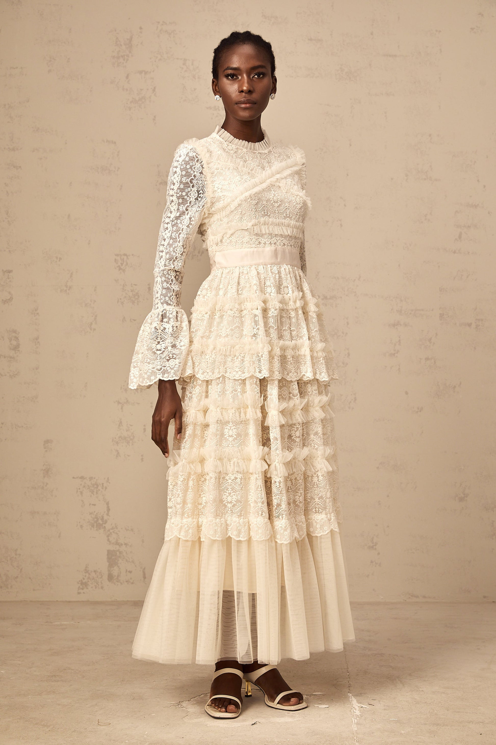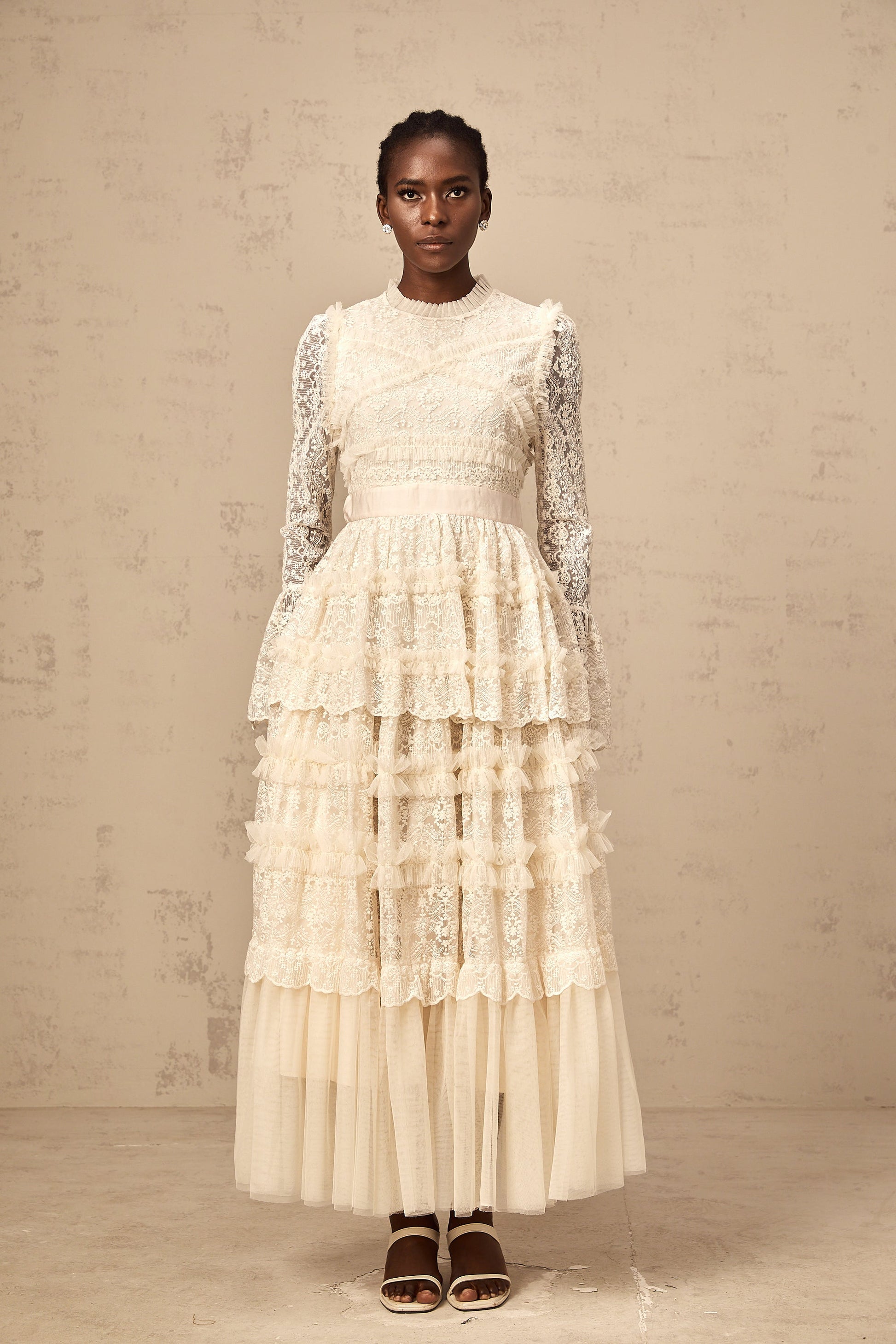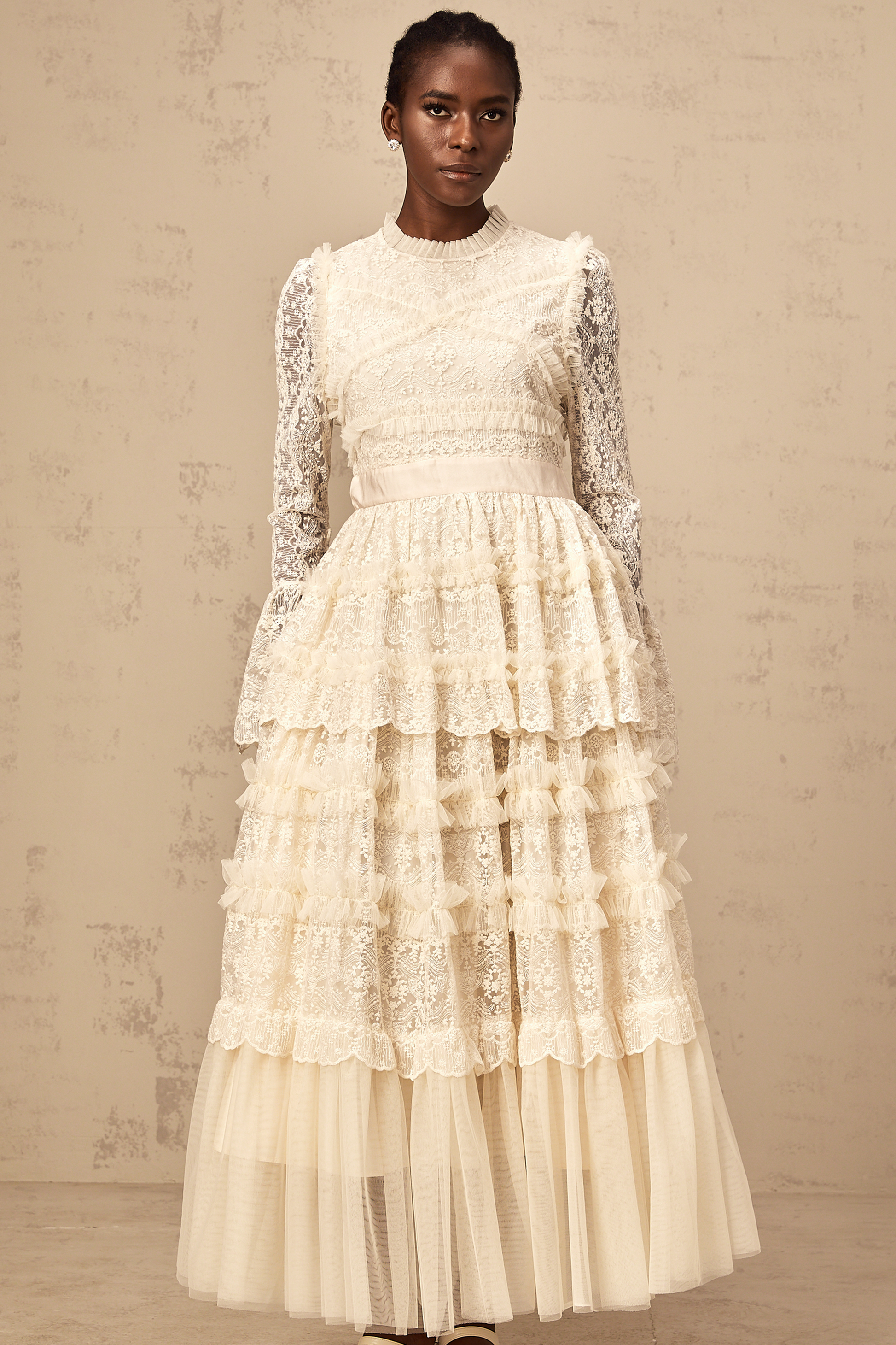 Agnès neutrals lace-panel ruffled tulle maxi dress