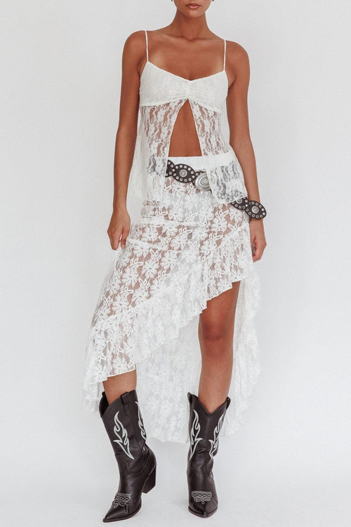 The Alondra Lace Split Top in white is the perfect blend of elegance and whimsy. Made with delicate lace, this top features a flattering cutaway design that will flatter any body type. The ultimate addition to your wardrobe, it will add a touch of playful charm to any outfit. Perfect for a romantic date night with your lover teamed with wide-leg jeans and kitten heels for a look we are loving.