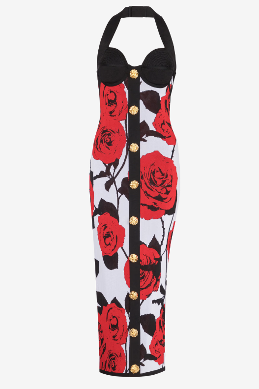 Introducing the Amiya Rose Jacquard Halter Midi Bandage Dress. This stunning piece features a halter neckline and a rose print, bringing a touch of elegance to any occasion. The button details add a delicate touch, while the bandage design flatters your figure. Elevate your wardrobe with this exclusive and sophisticated dress.