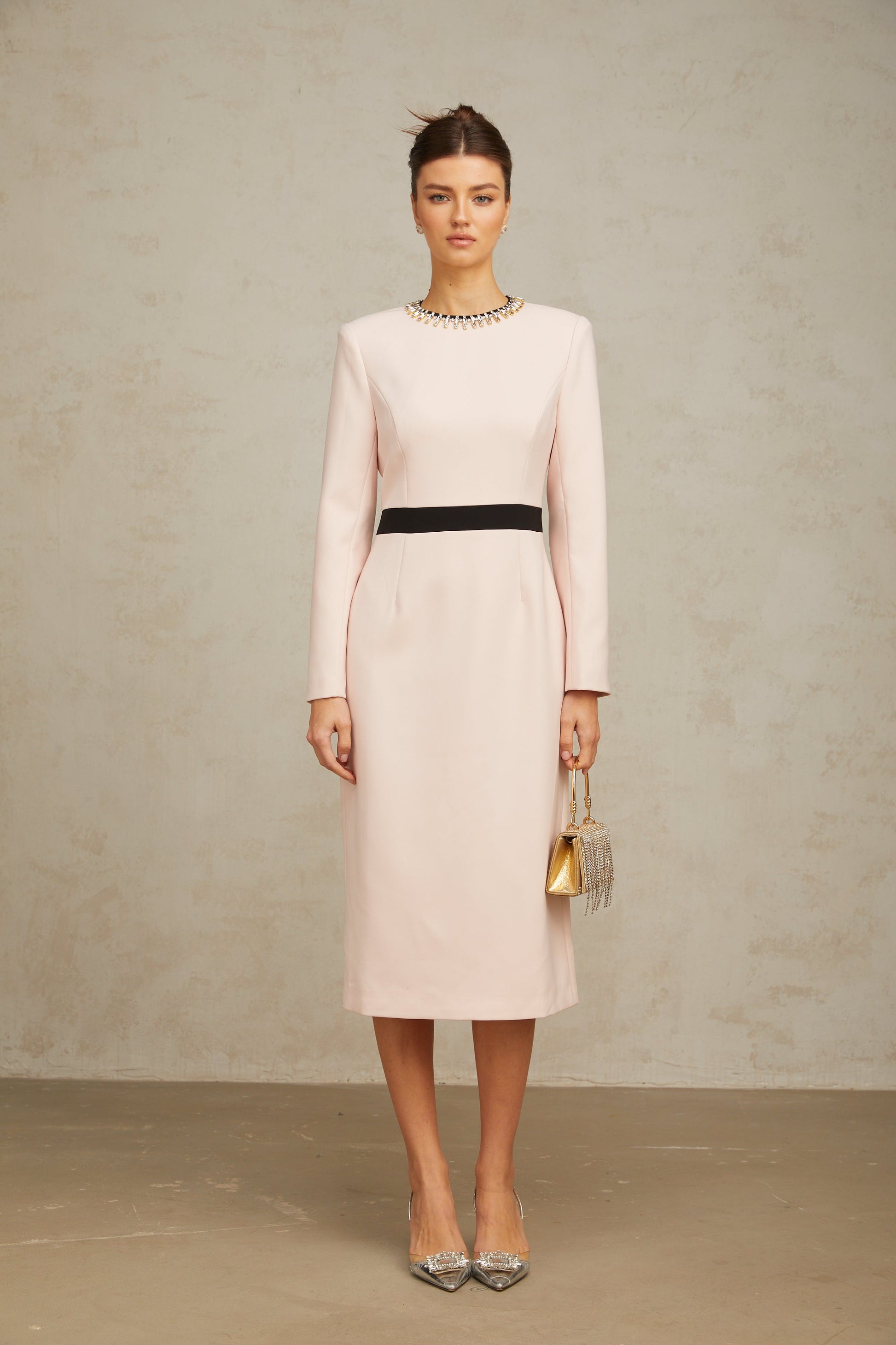 Anaïs pink crystal color-blocked midi dress