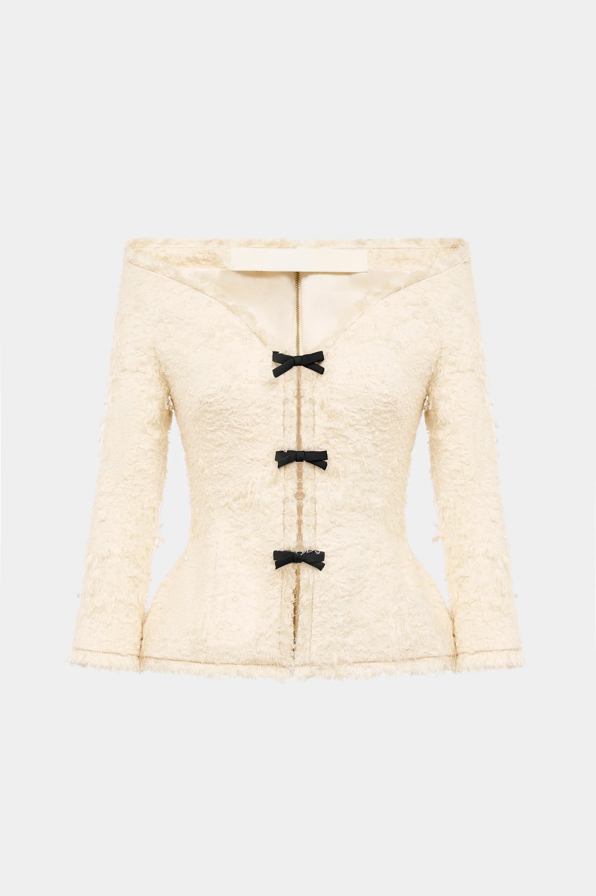 Arife Off Shoulder Bow Crystal Embellished Blazer Two Piece Set - Beige