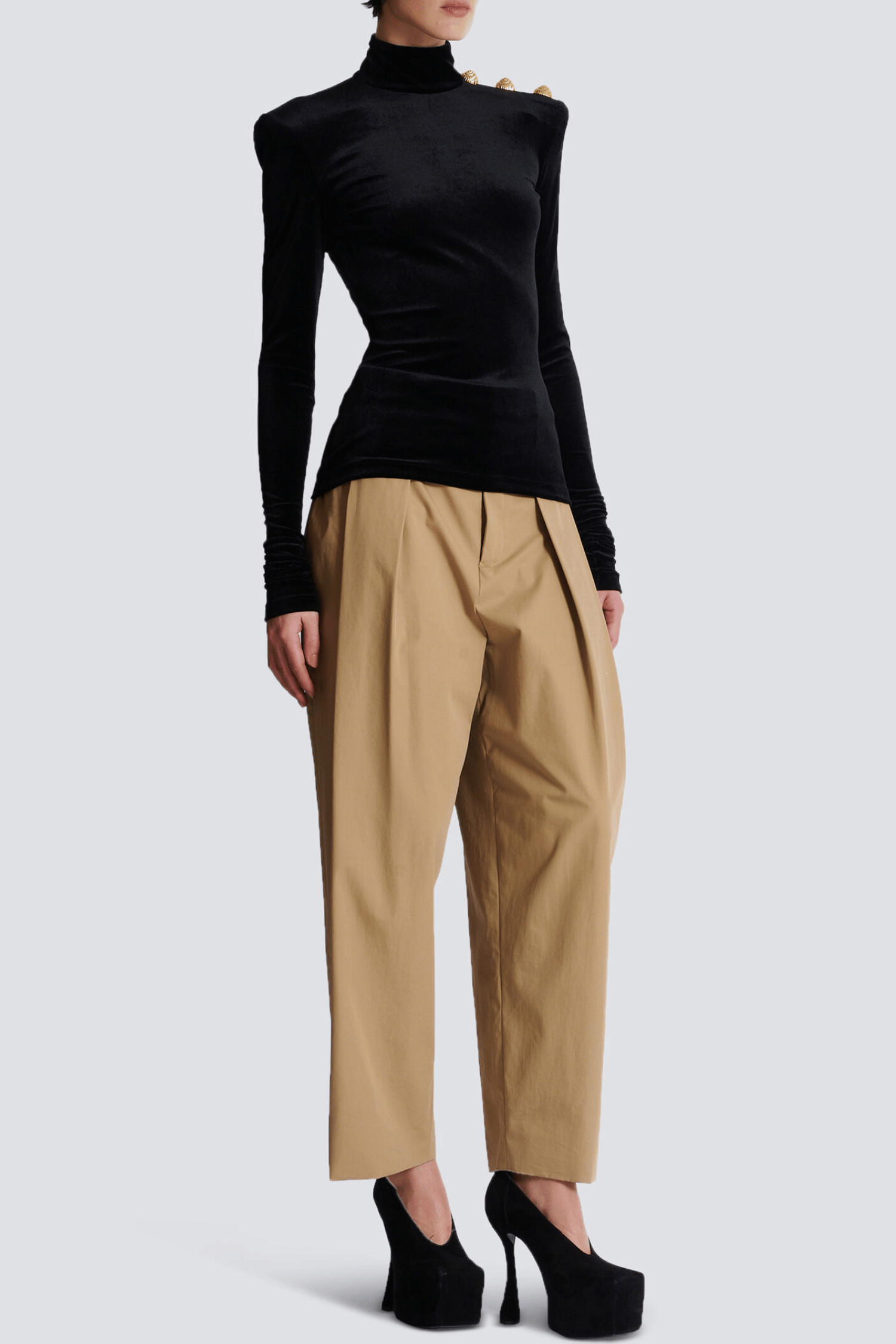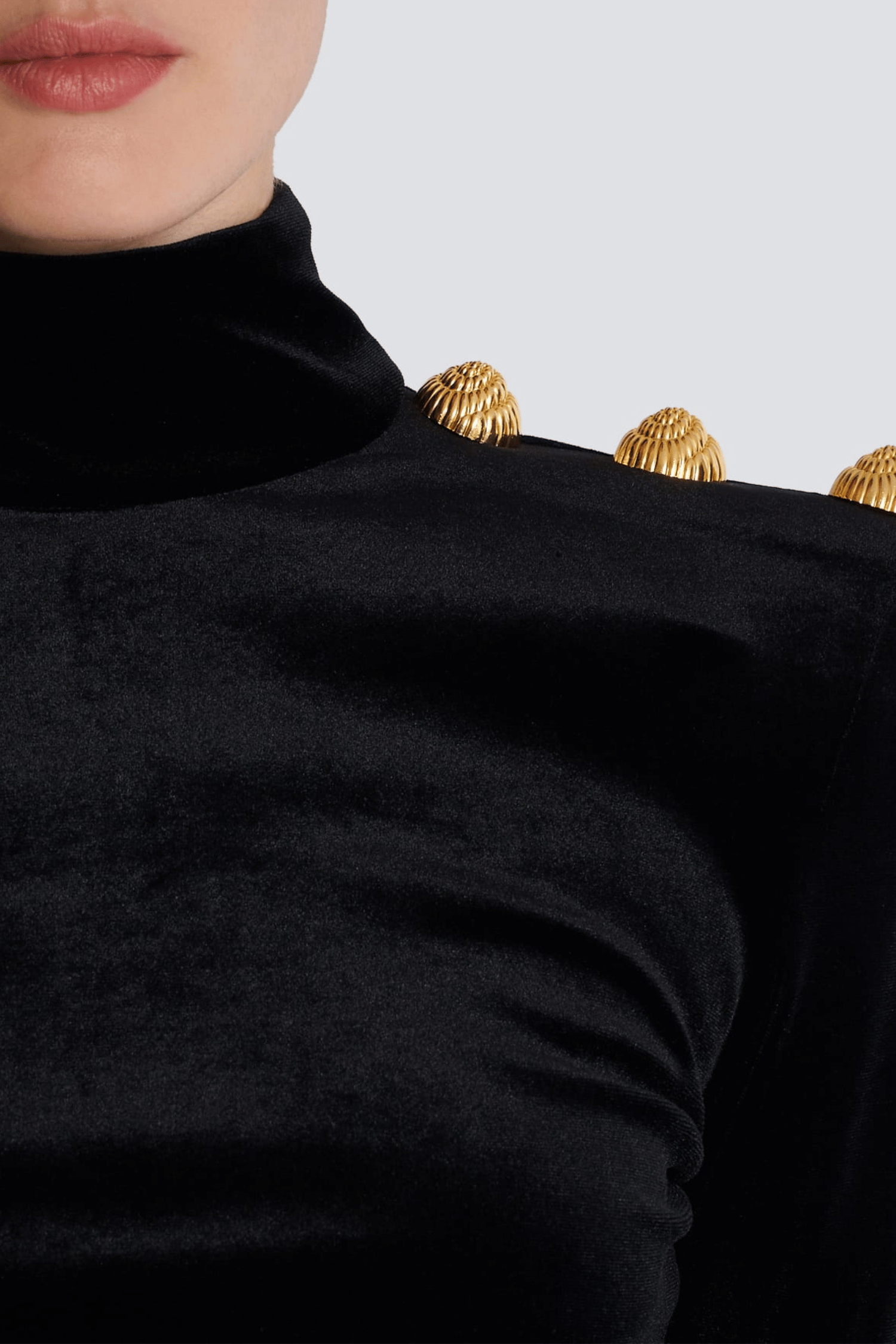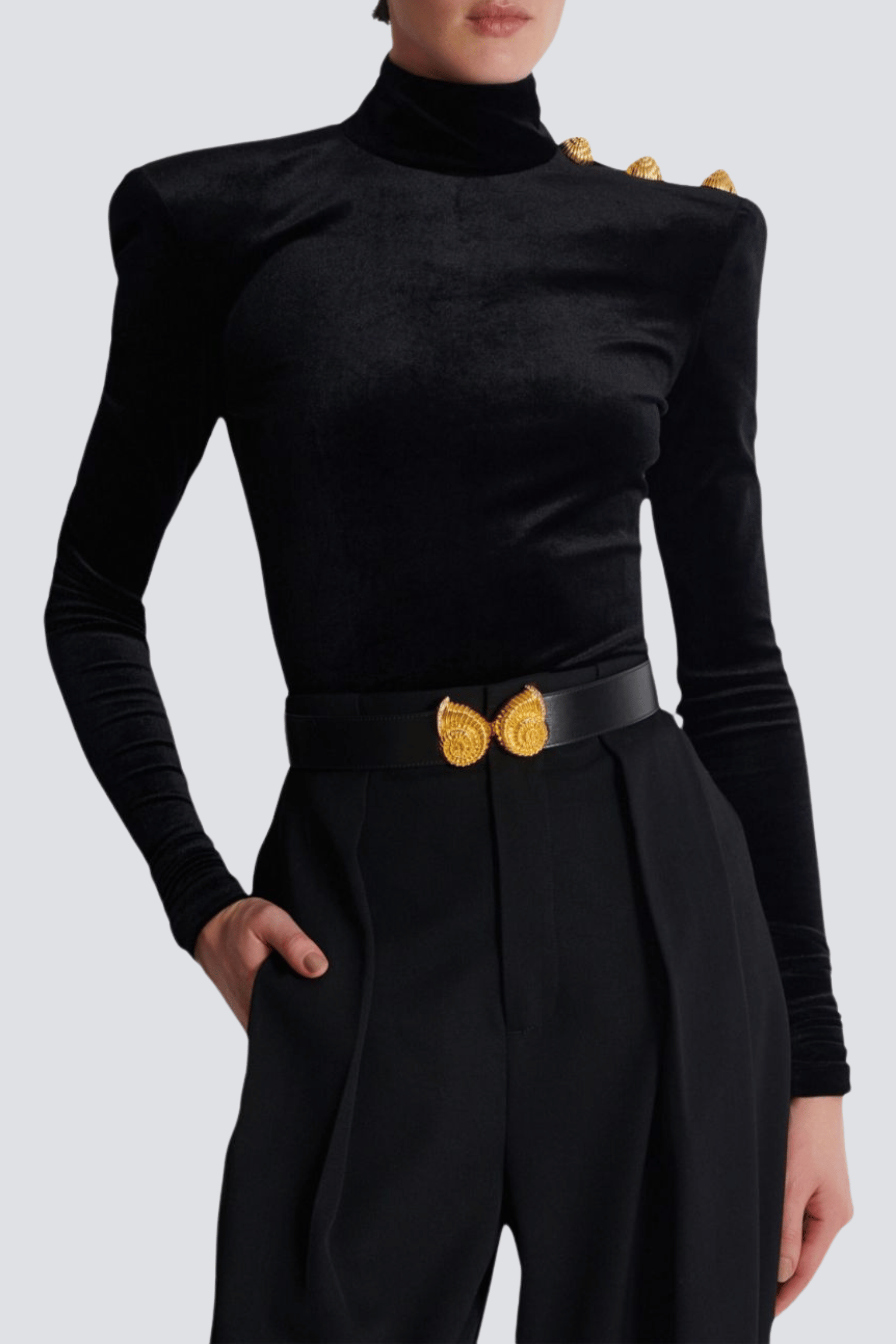 Indulge in luxury with our Asina Velvet Gold Buttoned Top. Crafted from sumptuous velvet, this top features elegant gold buttons that add a touch of sophistication. Perfect for any occasion, this top is both stylish and timeless. Elevate your wardrobe with this exclusive piece and make a statement wherever you go.