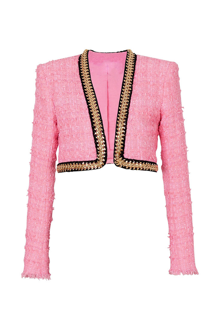 Introducing the Betty Tweed Chain Crop Top in pink, a sophisticated and exclusive piece from our premium collection. Crafted with a tweed fabric and adorned with a delicate chain, this top exudes elegance and luxury. Elevate your wardrobe with this tasteful garment that alludes to the world of high fashion.