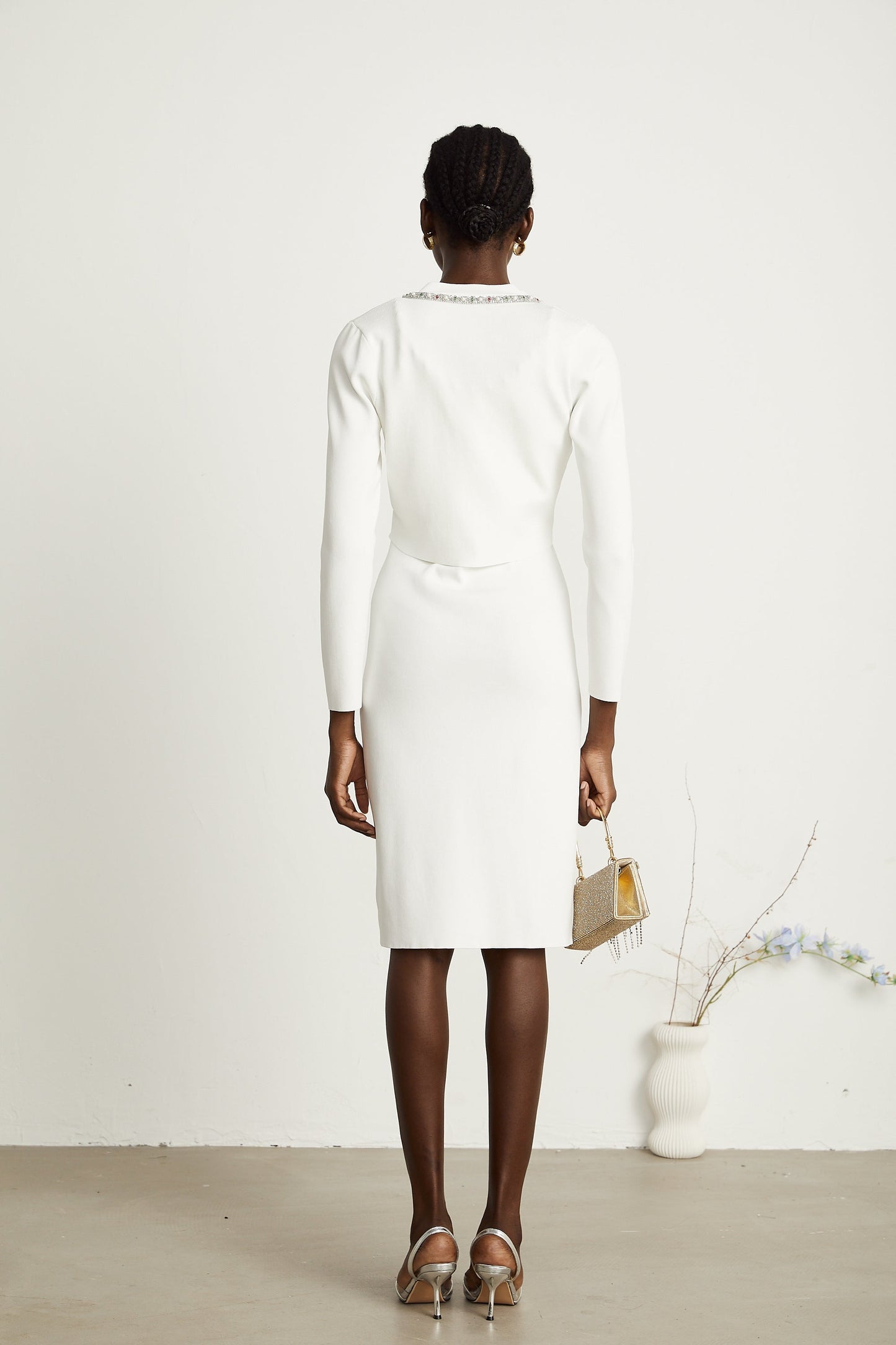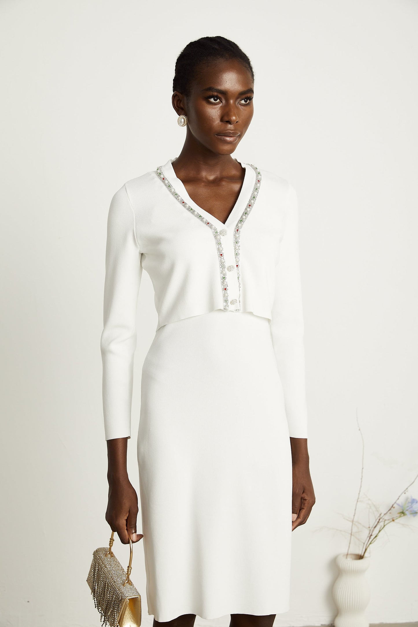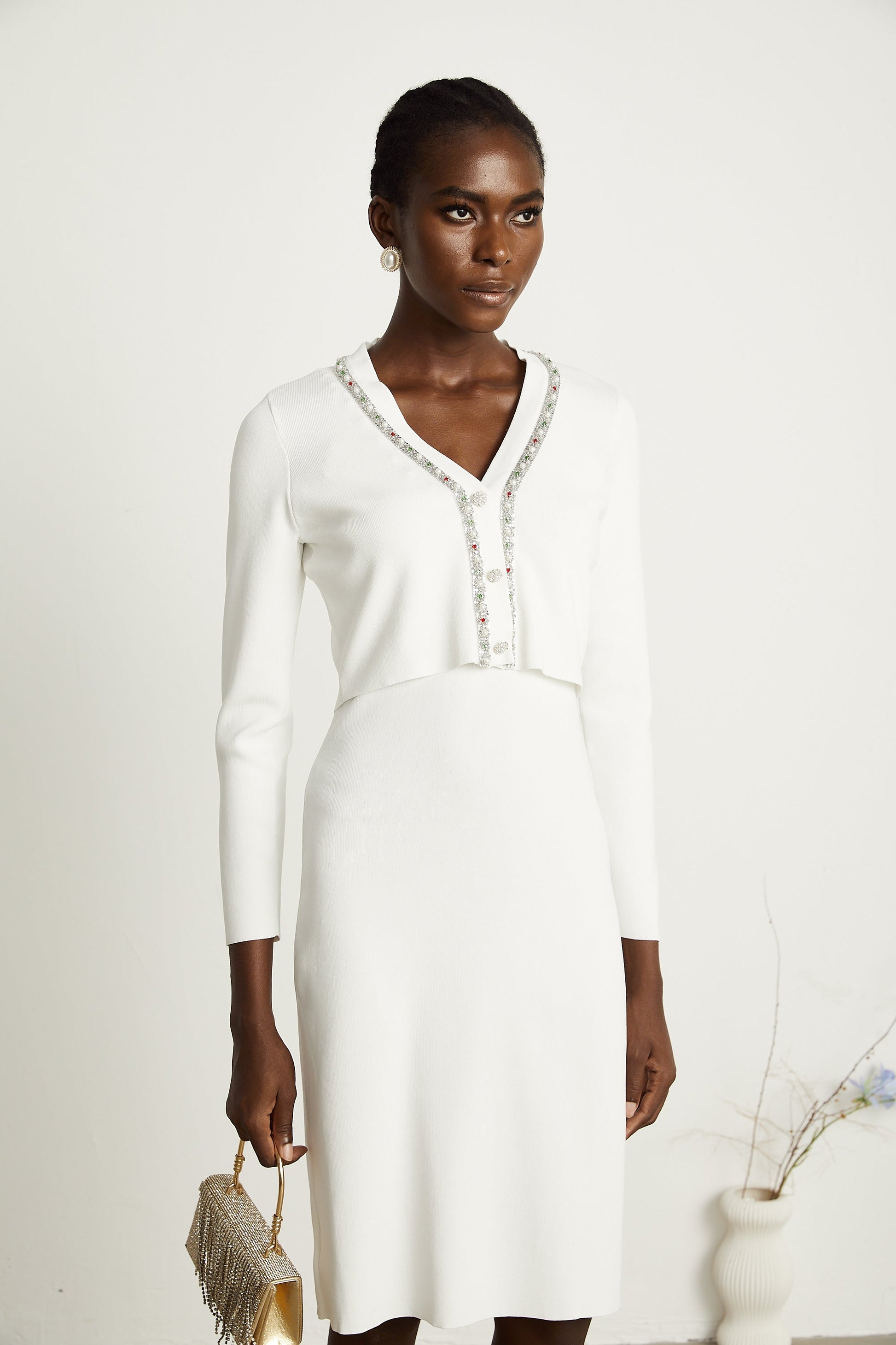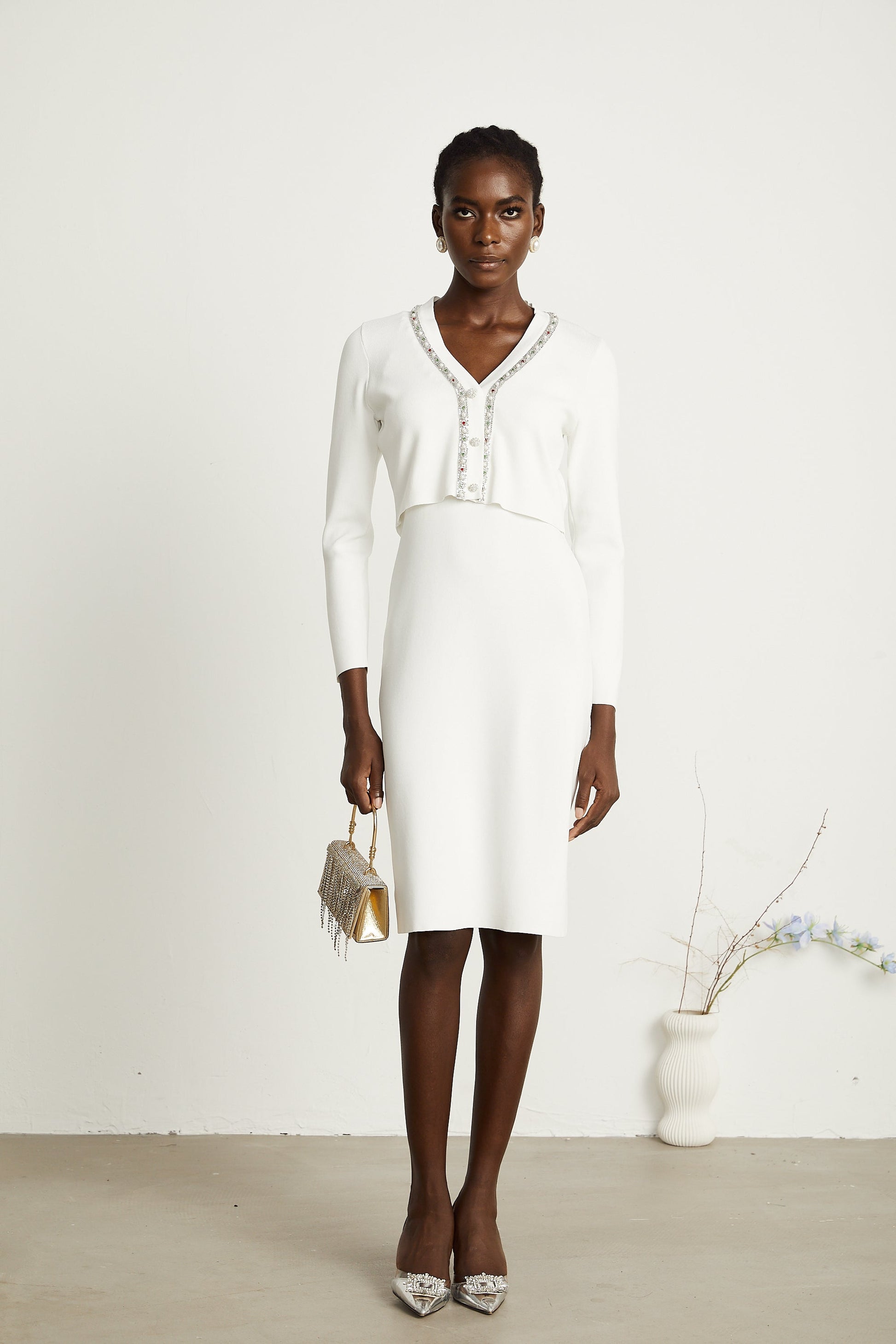 Blanche white bead-embellished cardigan & dress matching set