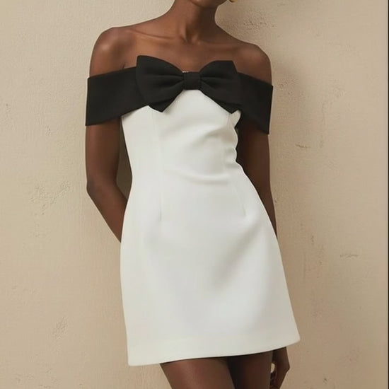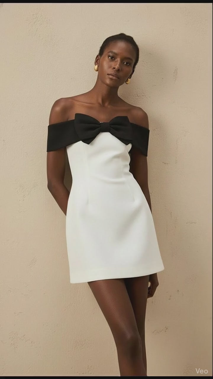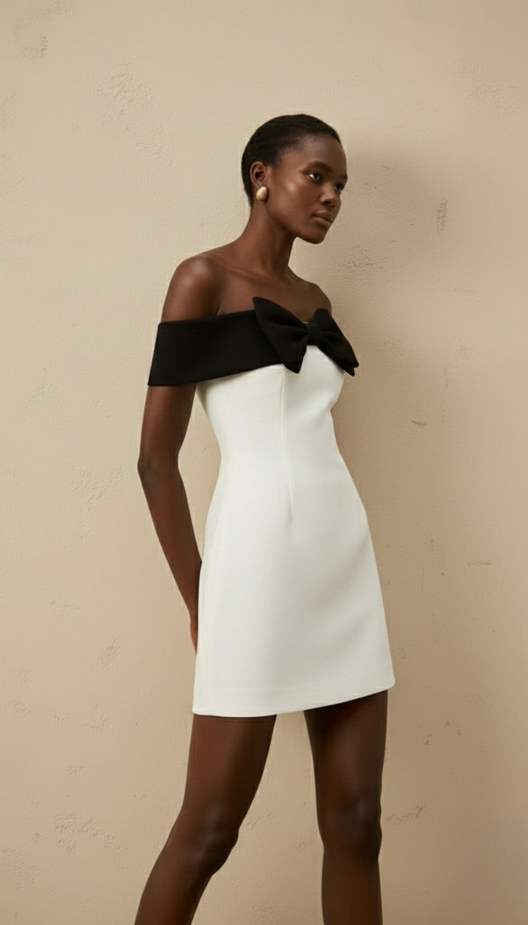 A refined blend of feminine elegance and modern allure. The Ariana Bow-Splice Mini Dress features a sculpted silhouette, a high-waist fit, and a soft off-shoulder neckline accented with a statement bow. Designed for nights out, special occasions, and unforgettable moments—where sophistication meets sensuality.