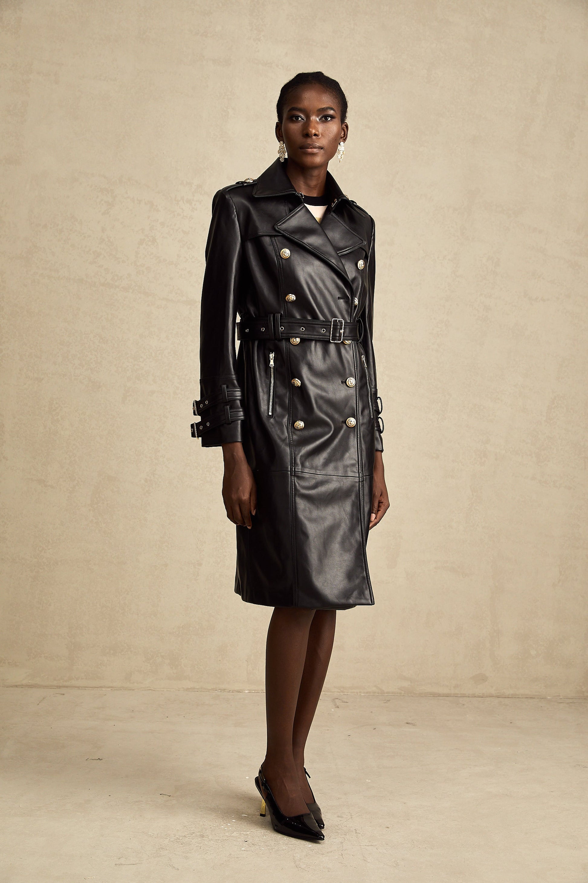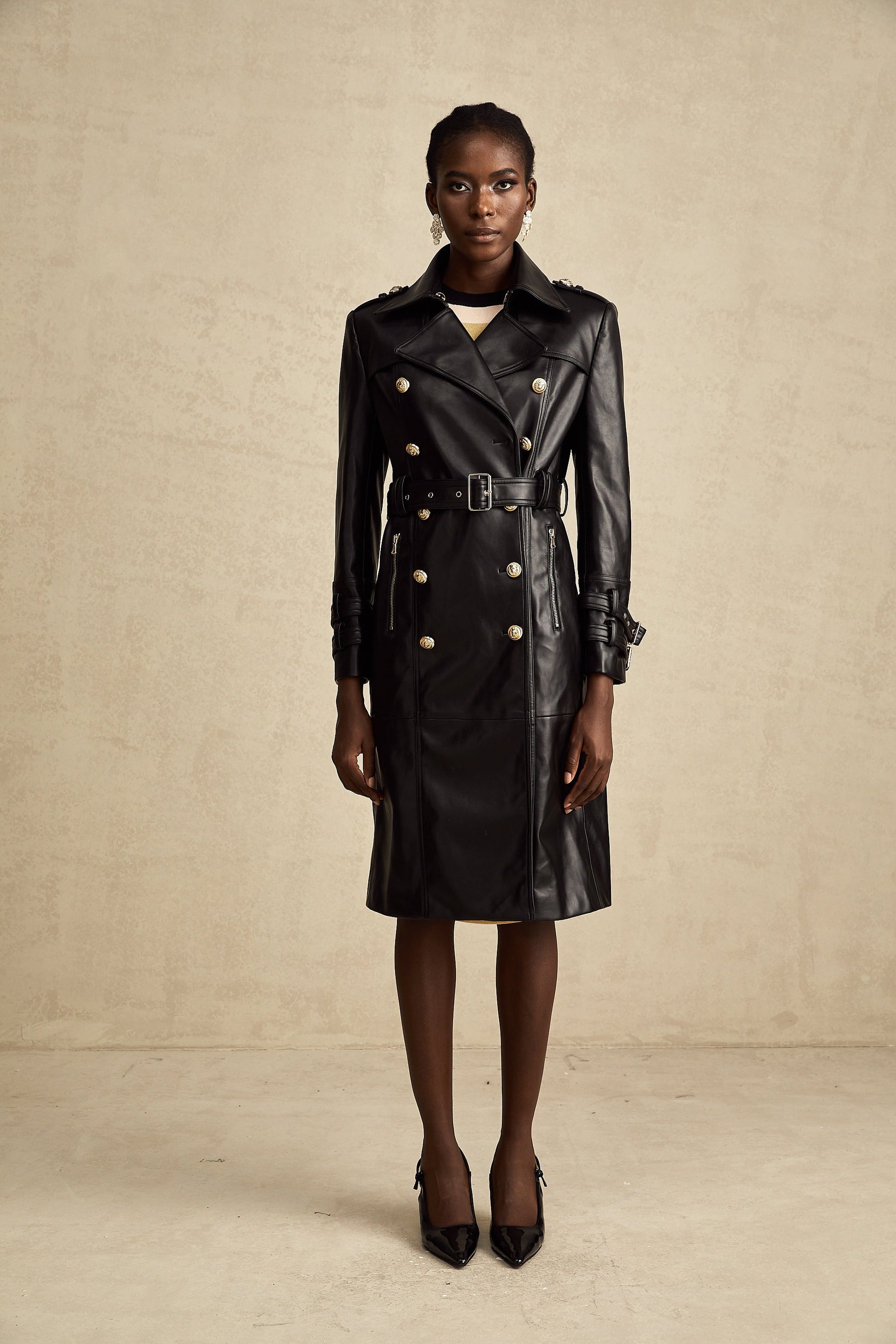 Camille black double-breasted belted leather coat