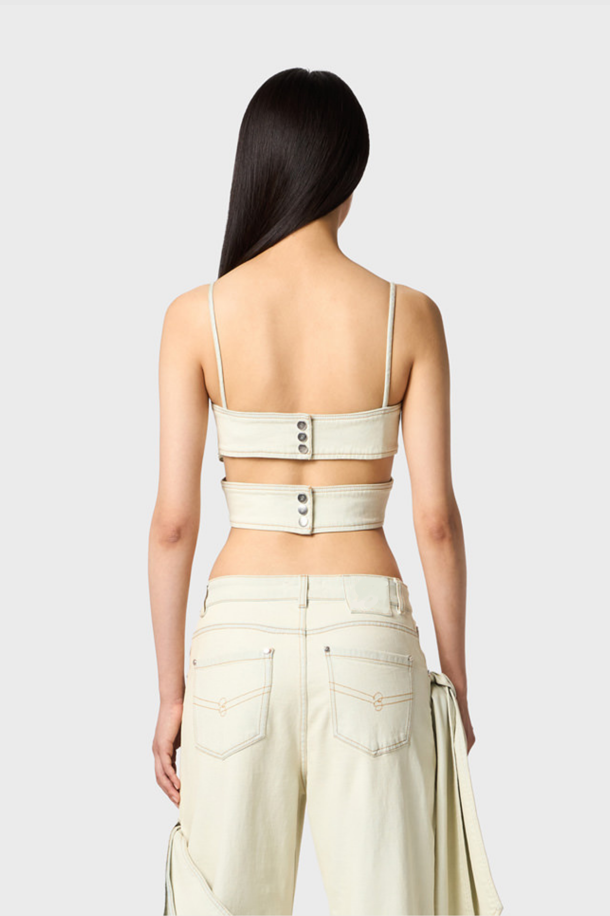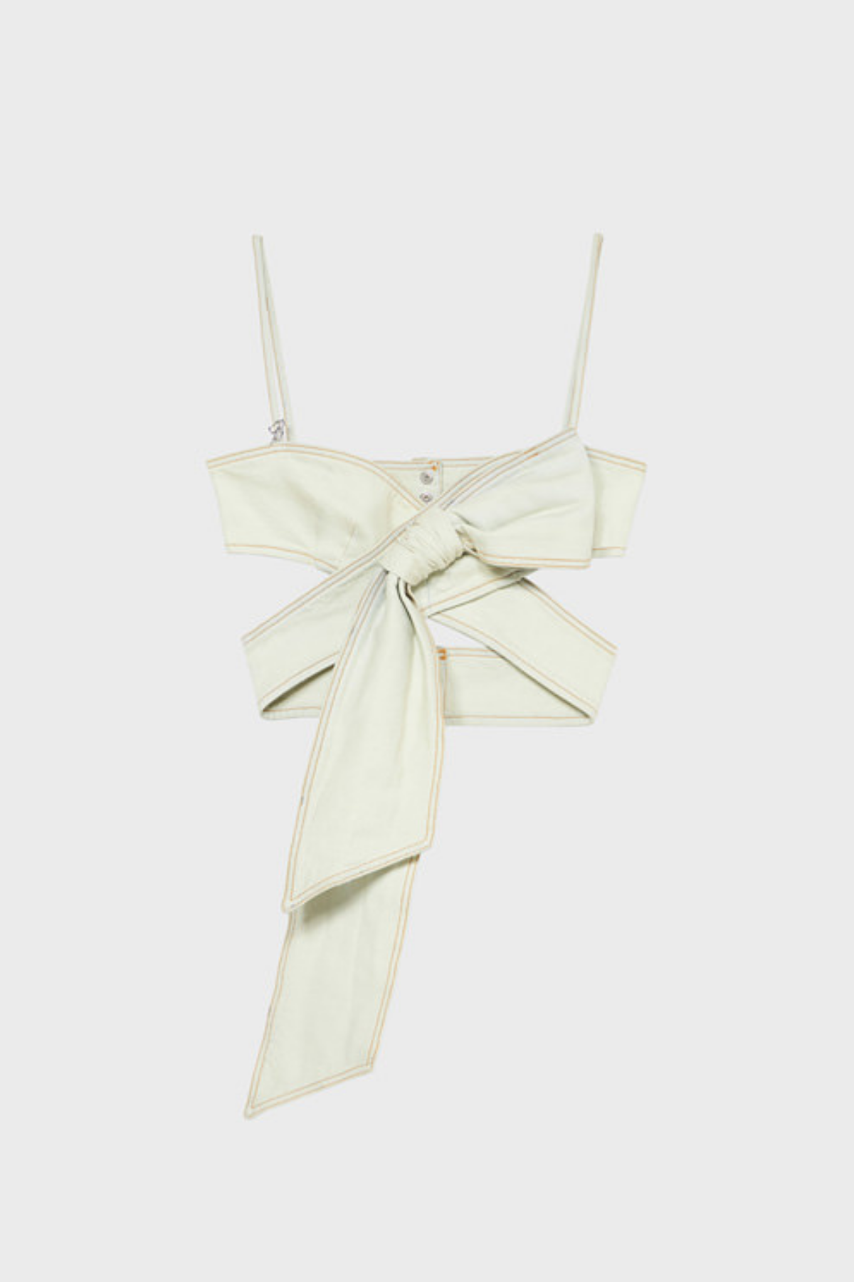 Introducing the Camille Bow Denim Top in white, a stylish addition to your wardrobe. Made from premium denim, this top features a delicate bow detail for a touch of sophistication. Perfect for any occasion, it will elevate your look and make you stand out in a crowd. Embrace luxury and elevate your style with Camille.