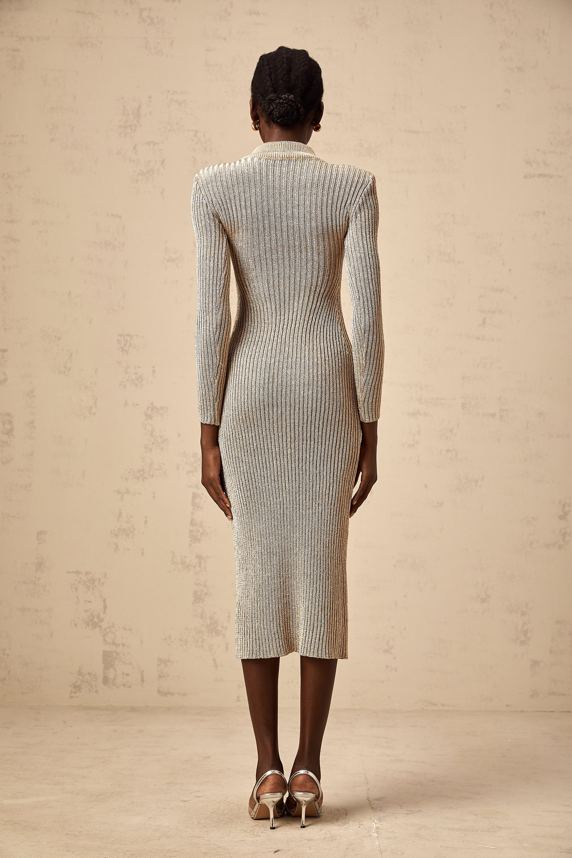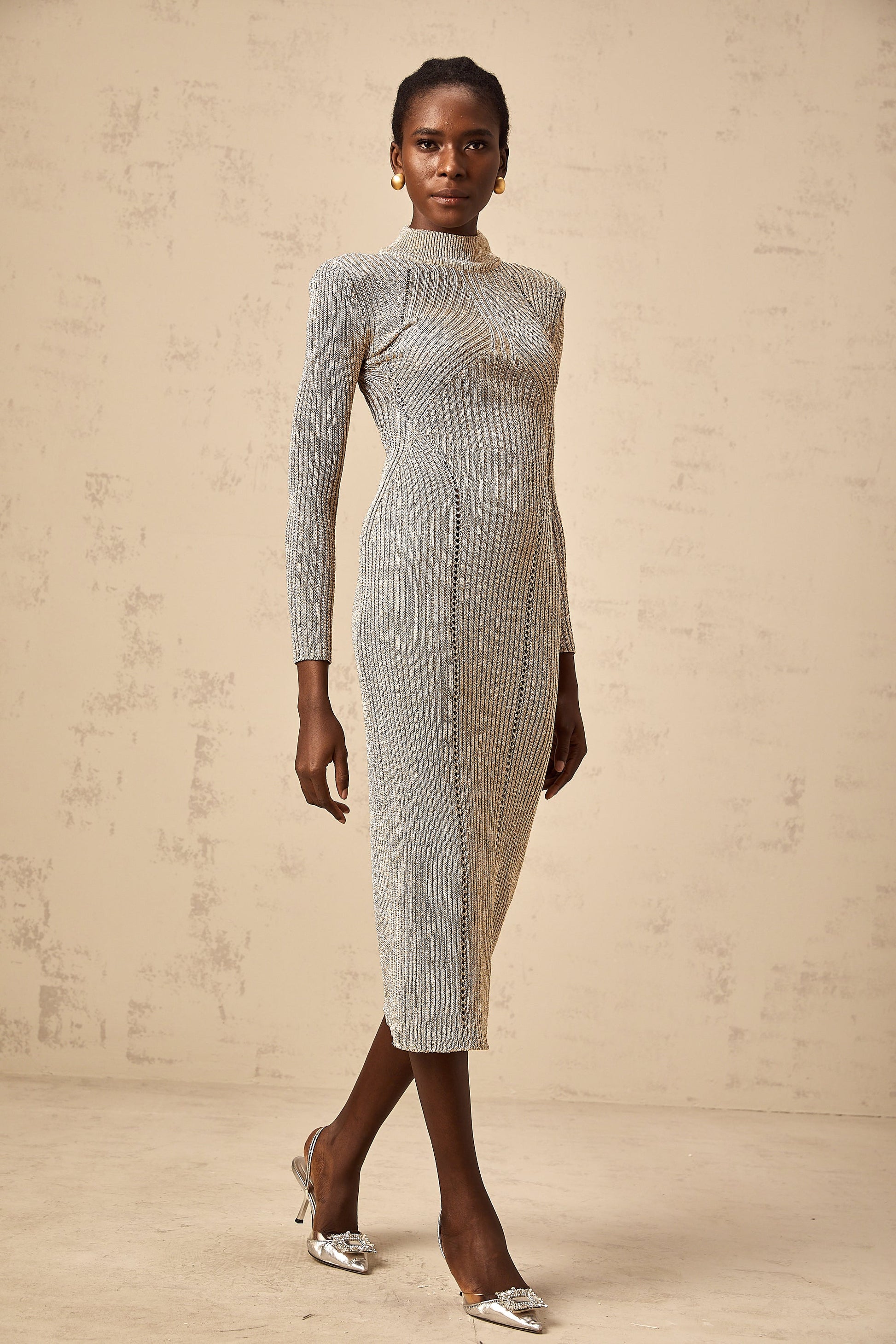Candice gold pointelle ribbed-knit midi dress