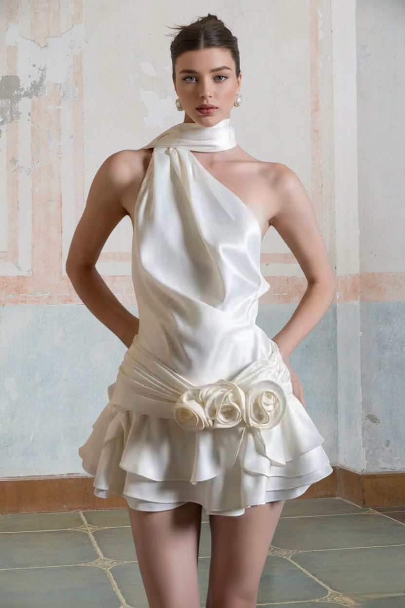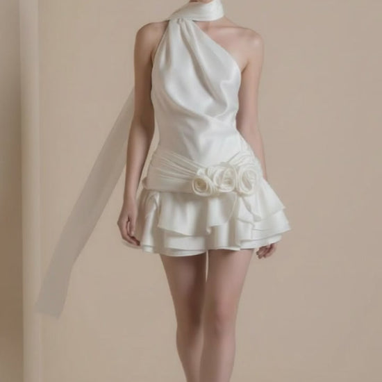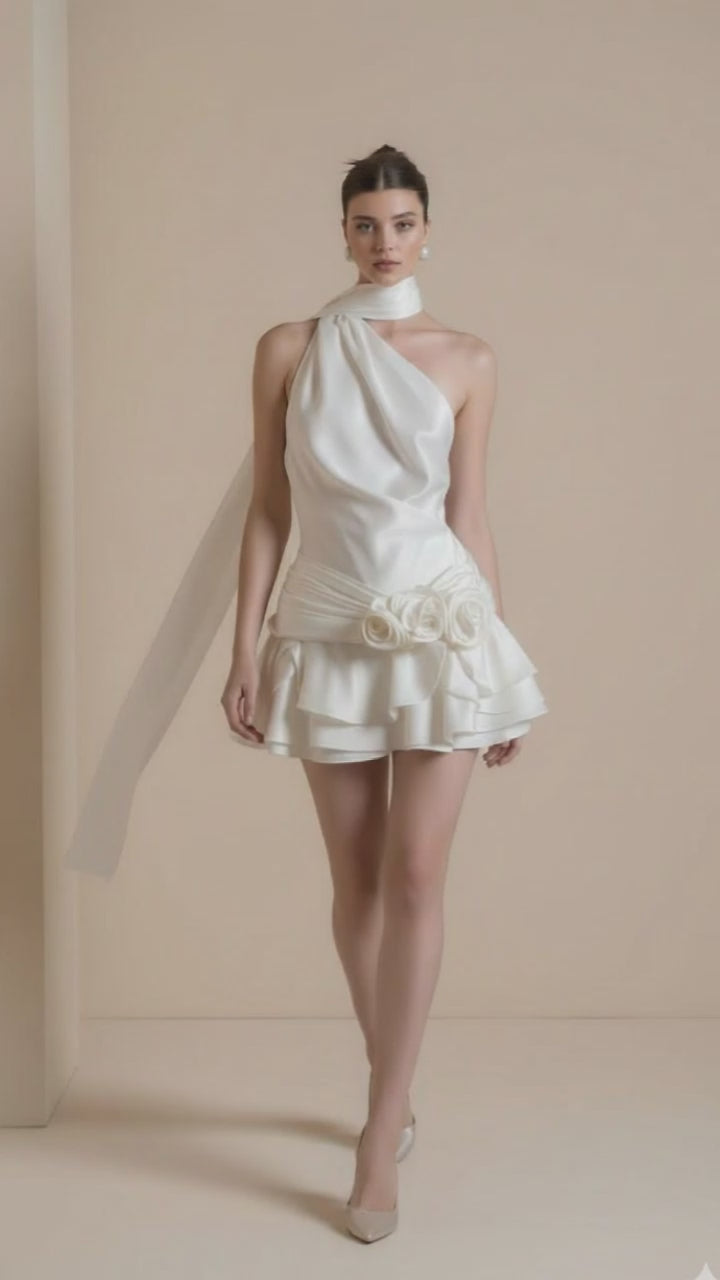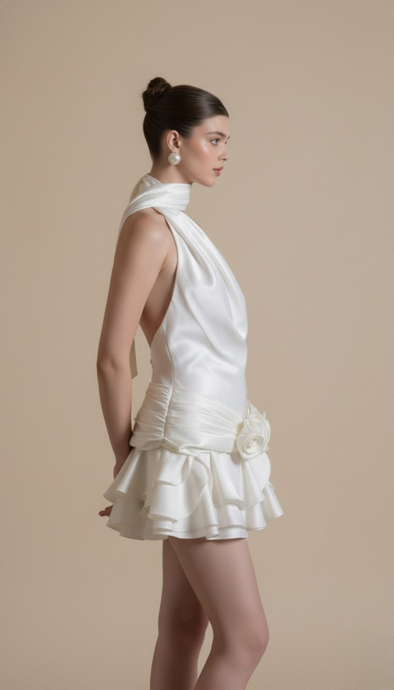 Soft satin fabric with a refined halter neckline and elegant open-back design.