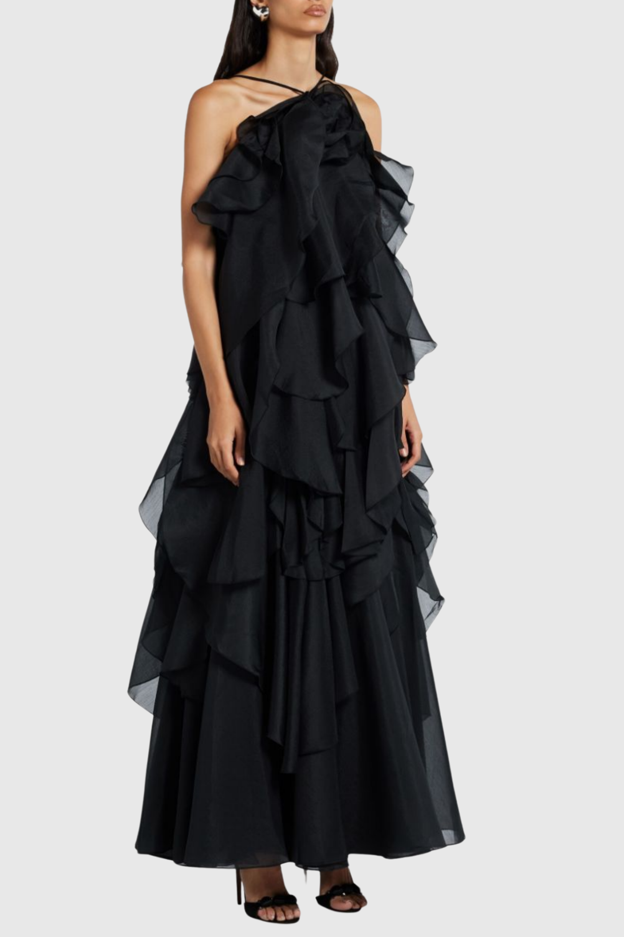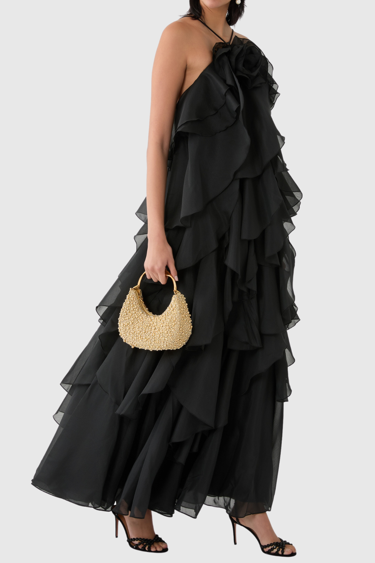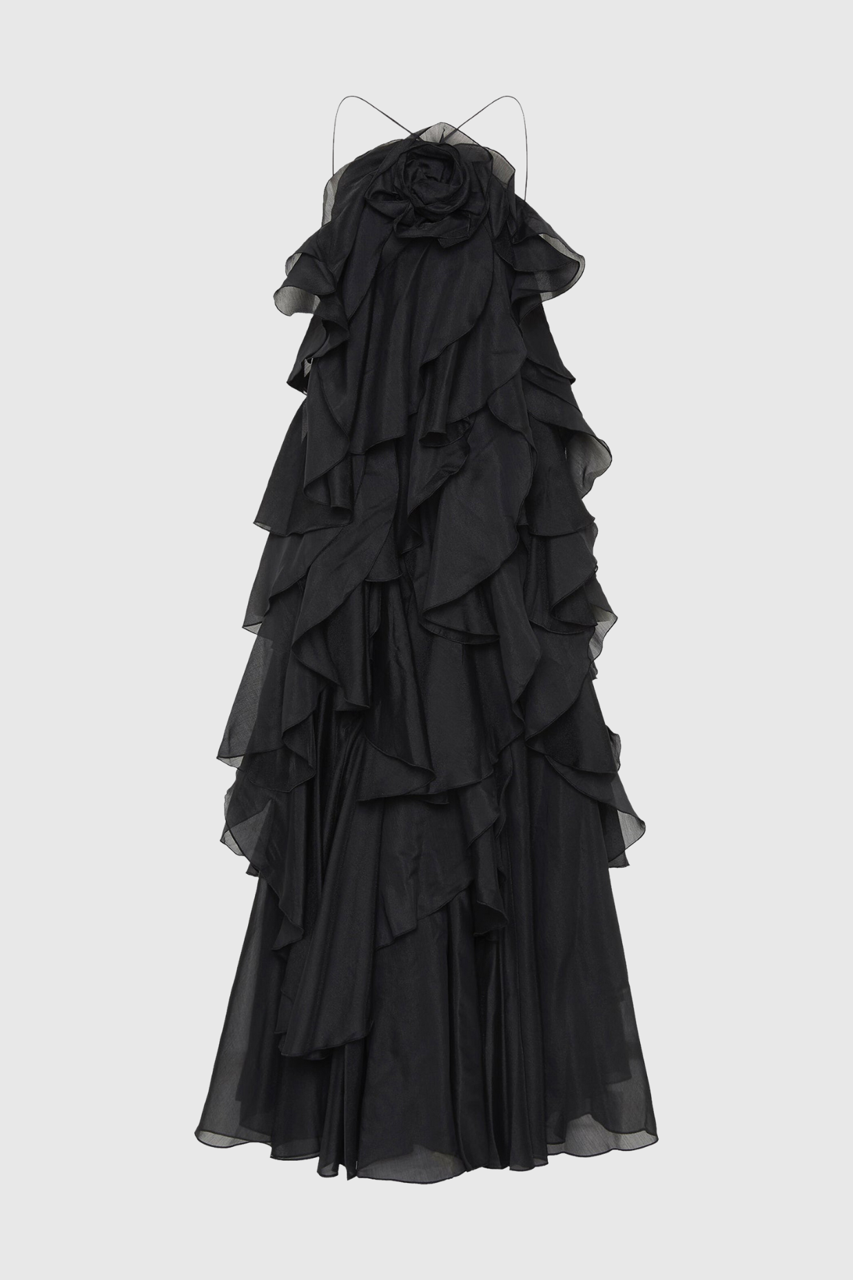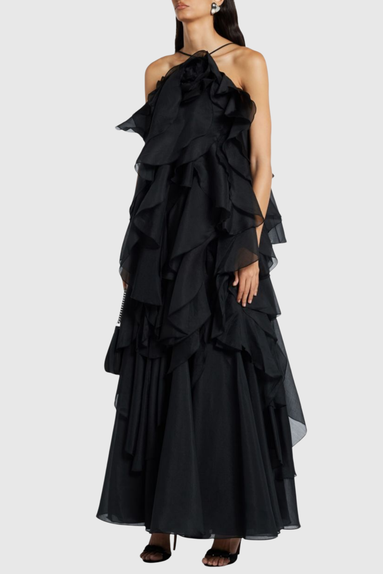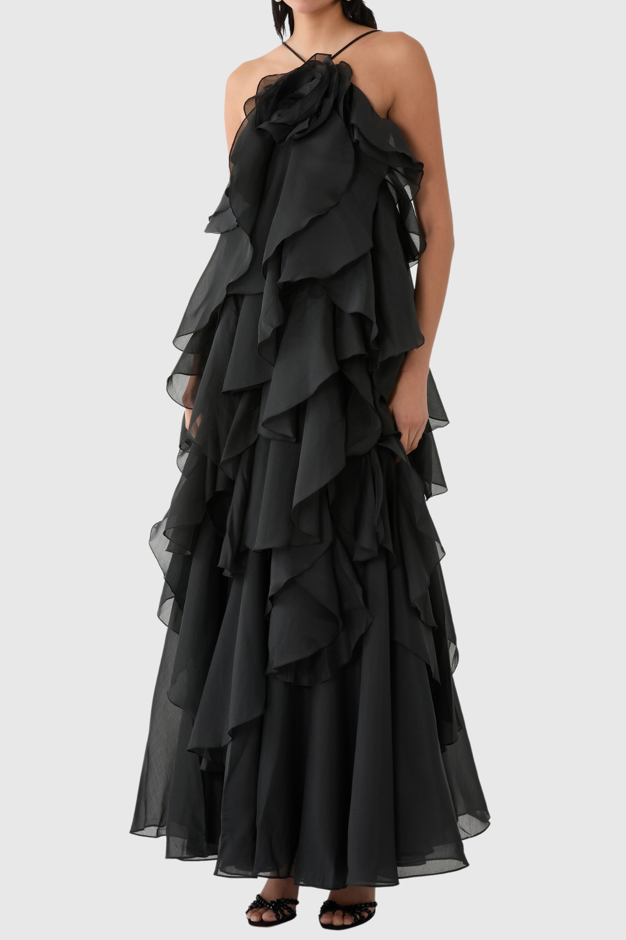 Caysie Halter Floral Ruffle Layered Maxi Dress - Black