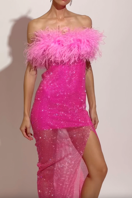Sparkle midi dress with an open neckline and shoulders, complemented by feathers. Dress has a high thigh slit for a contemporary twist. Crafted from our classic mesh translucent fabric covered in rhinestones.