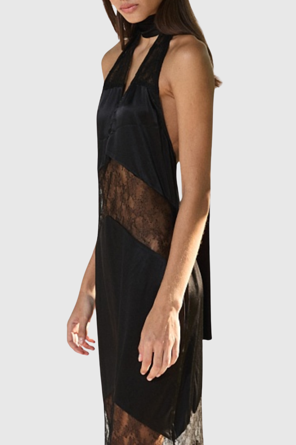 Indulge in luxury with our Clora Satin Halter Lace Maxi Dress in classic black. The satin material exudes elegance and the halter design adds a touch of sophistication. Featuring delicate lace detailing, this dress will make you feel like a work of art. Elevate your wardrobe with this exclusive piece.