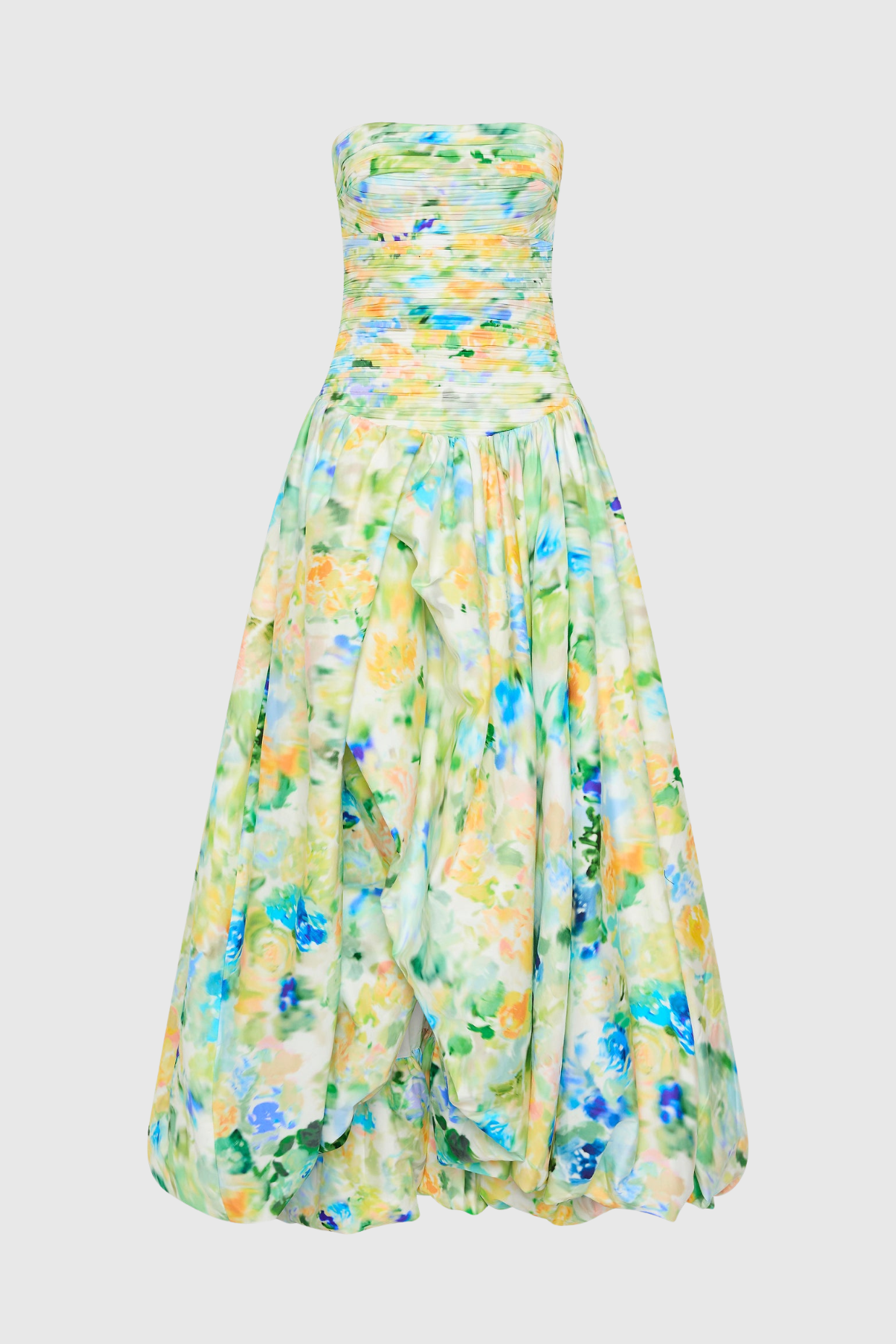 Coleka Floral Print Strapless Ruched Maxi Dress - Green