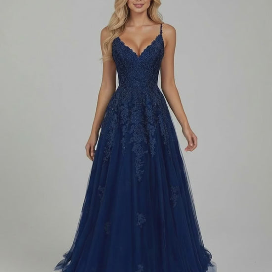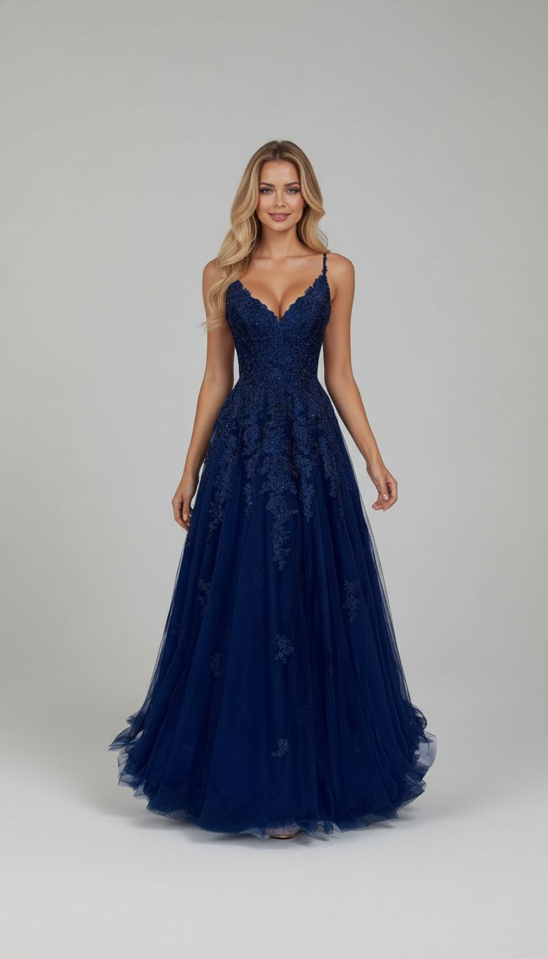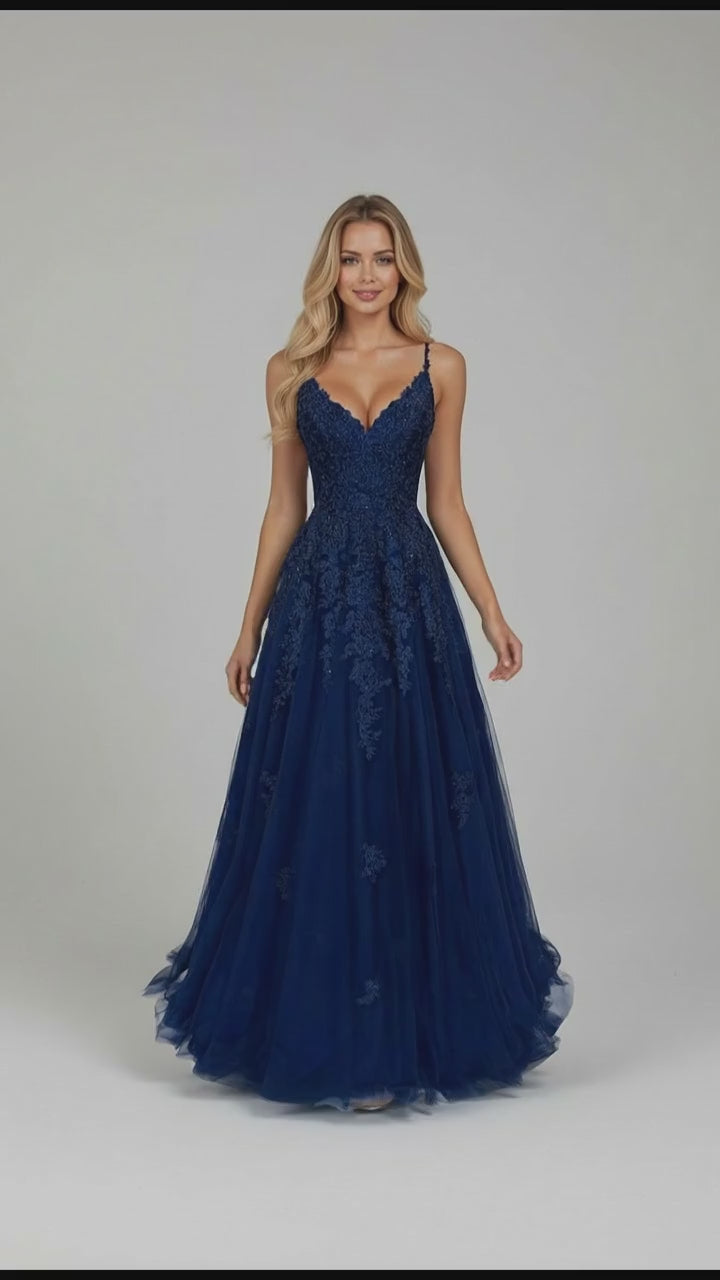 Description Step into a fairytale with this enchanting navy blue evening gown. The bodice is adorned with intricate floral lace appliques that cascade effortlessly onto the soft, voluminous tulle skirt. With delicate spaghetti straps and a flattering V-neckline, this dress creates a dreamy, ethereal silhouette perfect for your most magical nights.