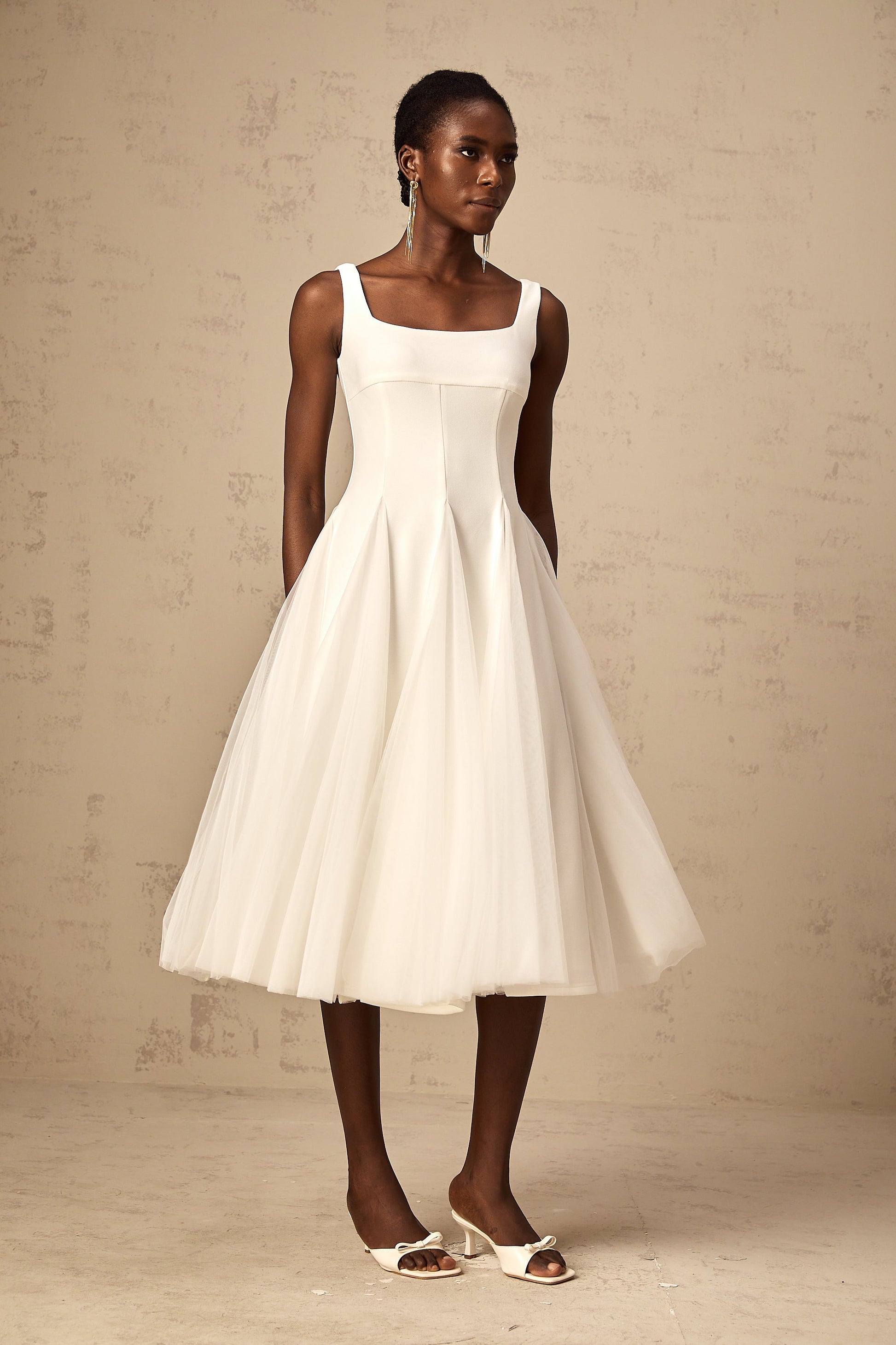 Danielle white tulle godet midi dress
