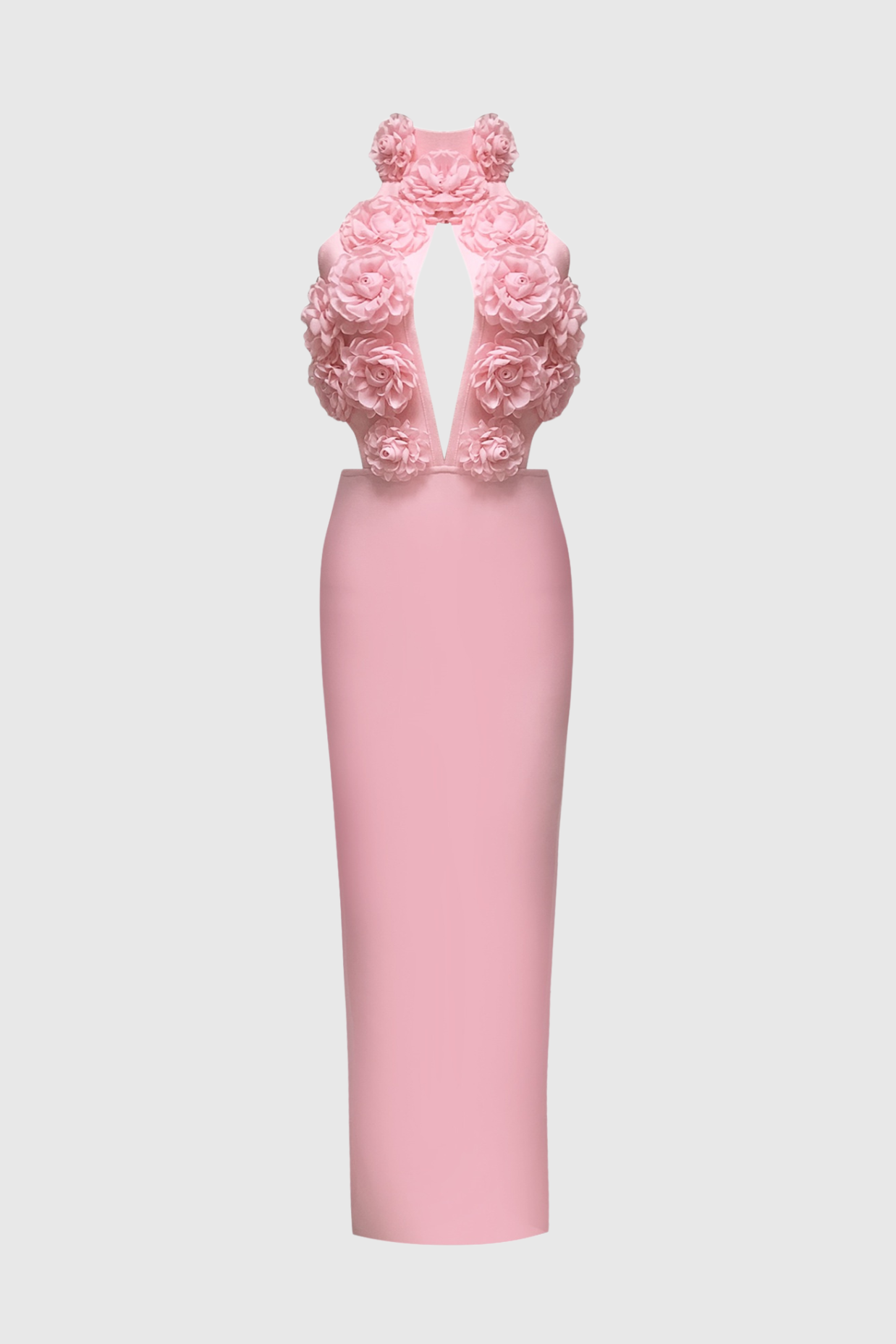 Datherine Floral Appliqué Halter Maxi Bandage Dress - Pink