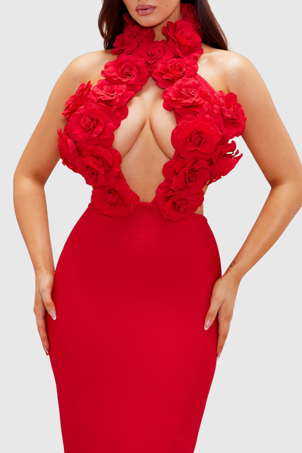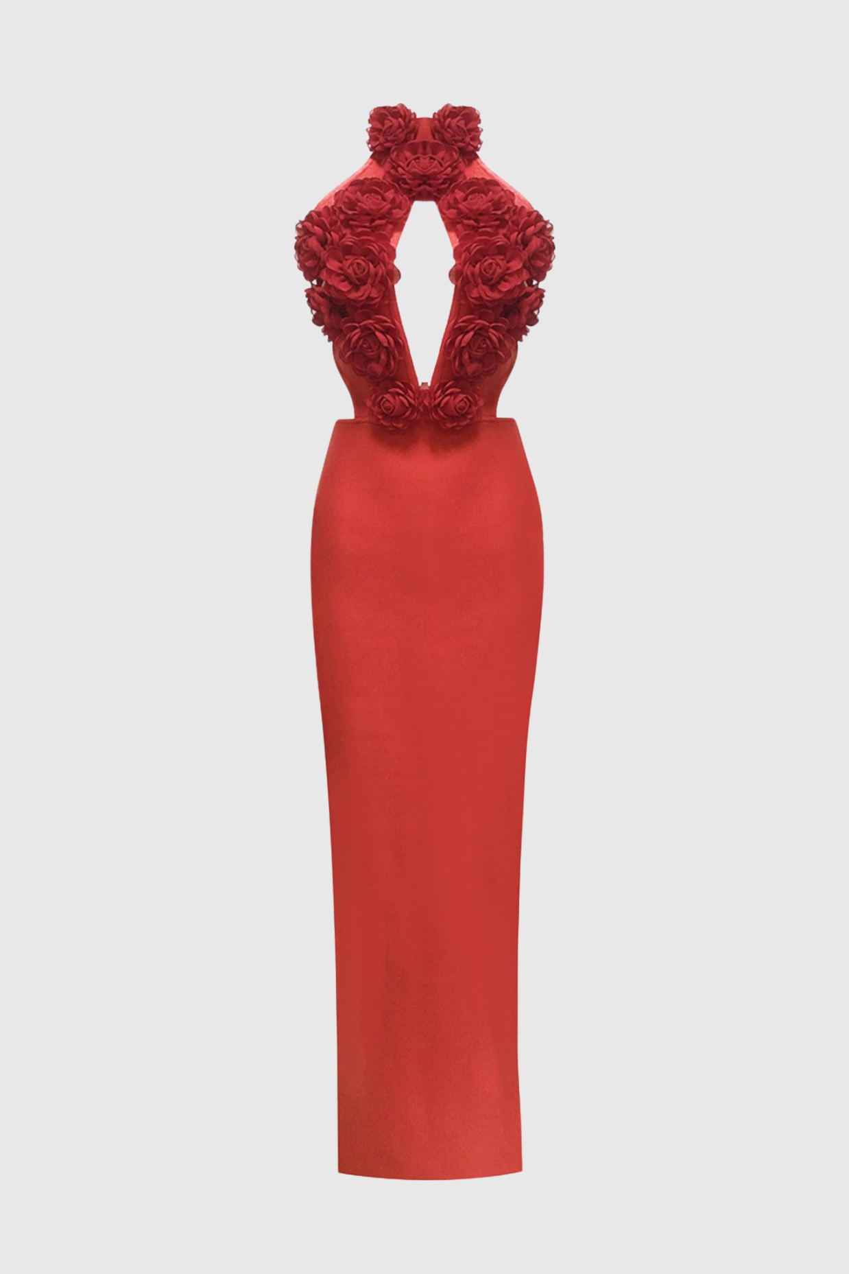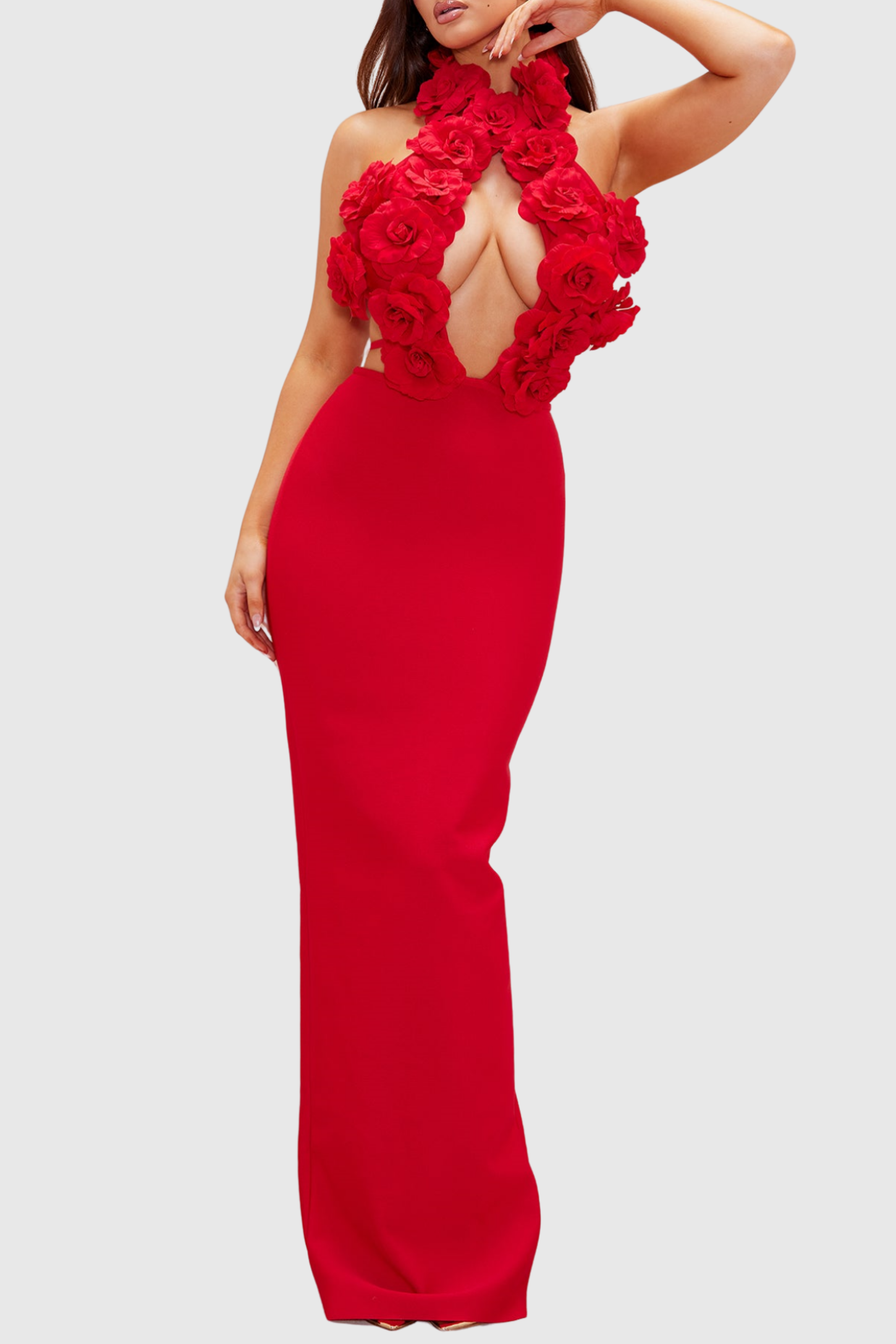 Indulge in luxury with the Datherine Floral Appliqué Halter Maxi Bandage Dress in stunning red. Adorned with delicate floral appliqués, this dress exudes elegance and sophistication. Perfect for a special occasion, the halter neckline and maxi length accentuate your figure, making you the center of attention. Elevate your wardrobe with this exclusive piece.