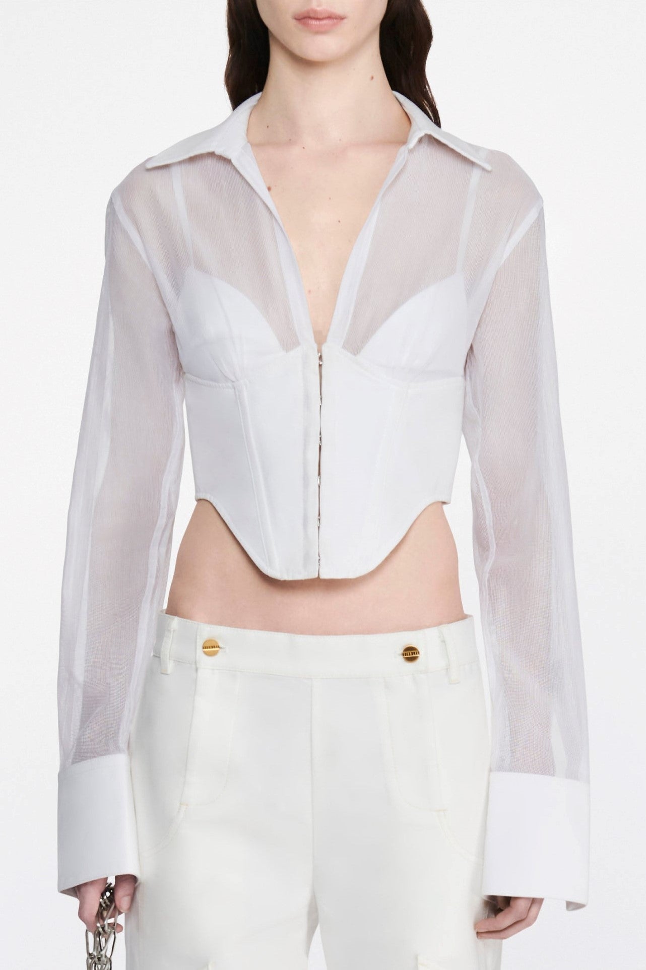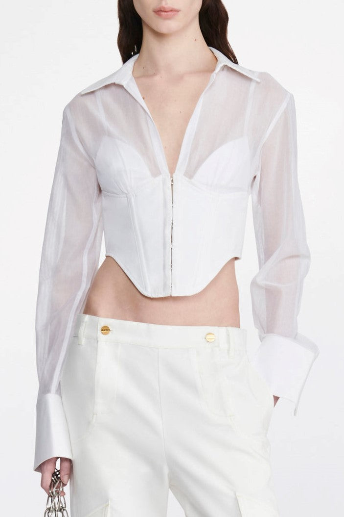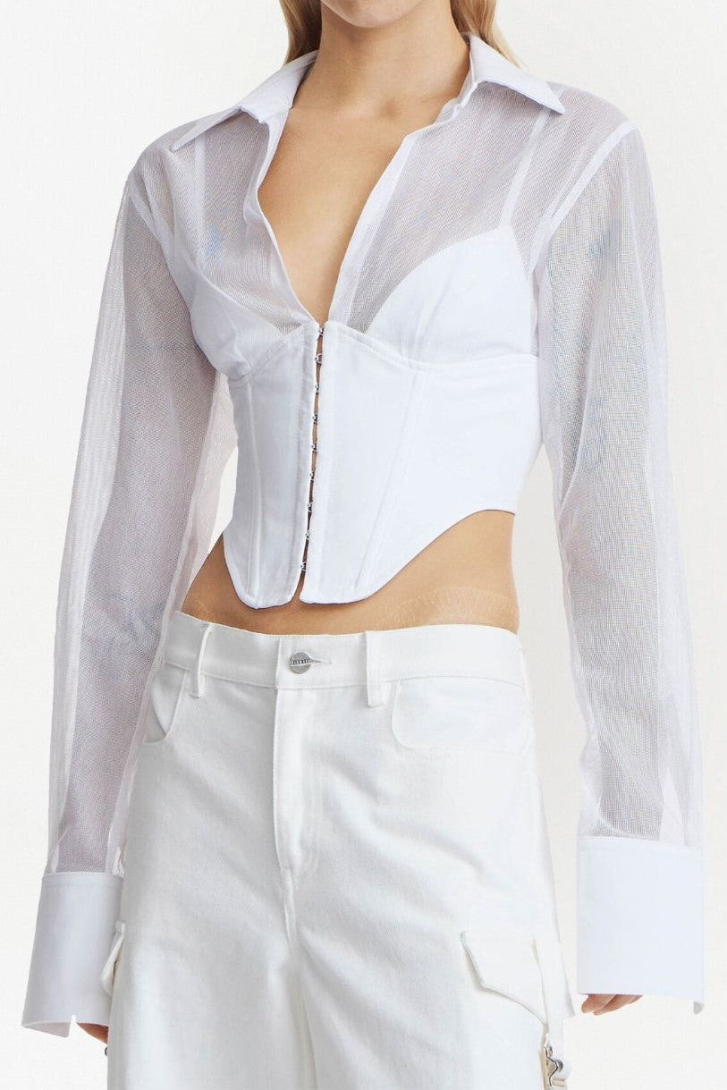 Delaney Grid Corset Shirt with integrated undercorset and internal soft cup bra. Cut entirely in organic cotton for a luxe, breathable piece. Upper is a sheer fine grid mesh with a crisp shirting contrast. Boned bodice with hook and eye centre front placket.