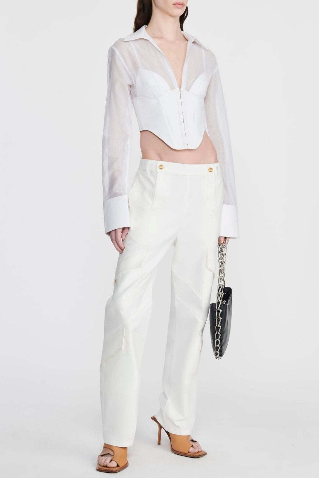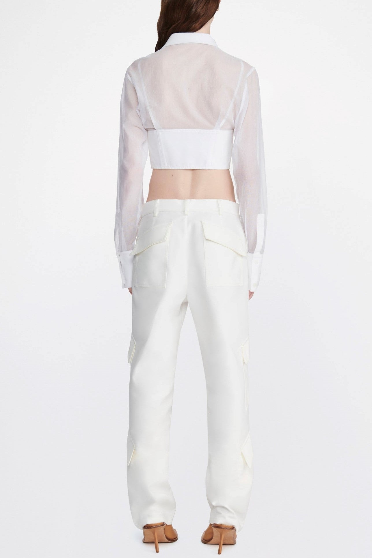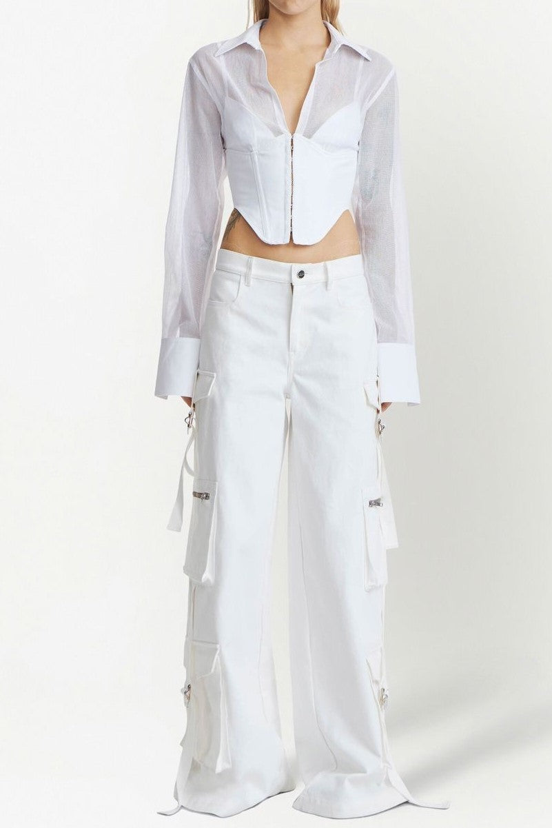 Delaney Grid Corset Shirt with integrated undercorset and internal soft cup bra. Cut entirely in organic cotton for a luxe, breathable piece. Upper is a sheer fine grid mesh with a crisp shirting contrast. Boned bodice with hook and eye centre front placket.