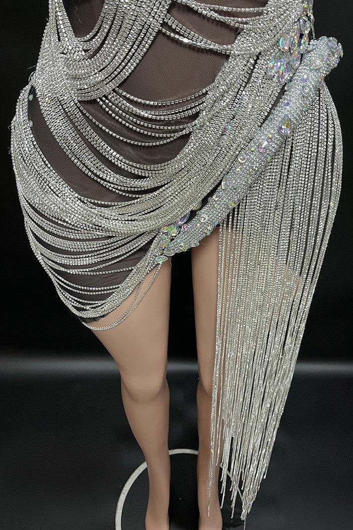 The handmade Delilah Rhinestone Strapless Mesh Mini Dress with silver fringes is a stunning and unique piece of clothing that is perfect for any occasion. It also has the Nude and Red.The dress features carefully handcrafted layers of shiny silver fringes that cascade above the black fabric, creating a beautiful and eye-catching effect.