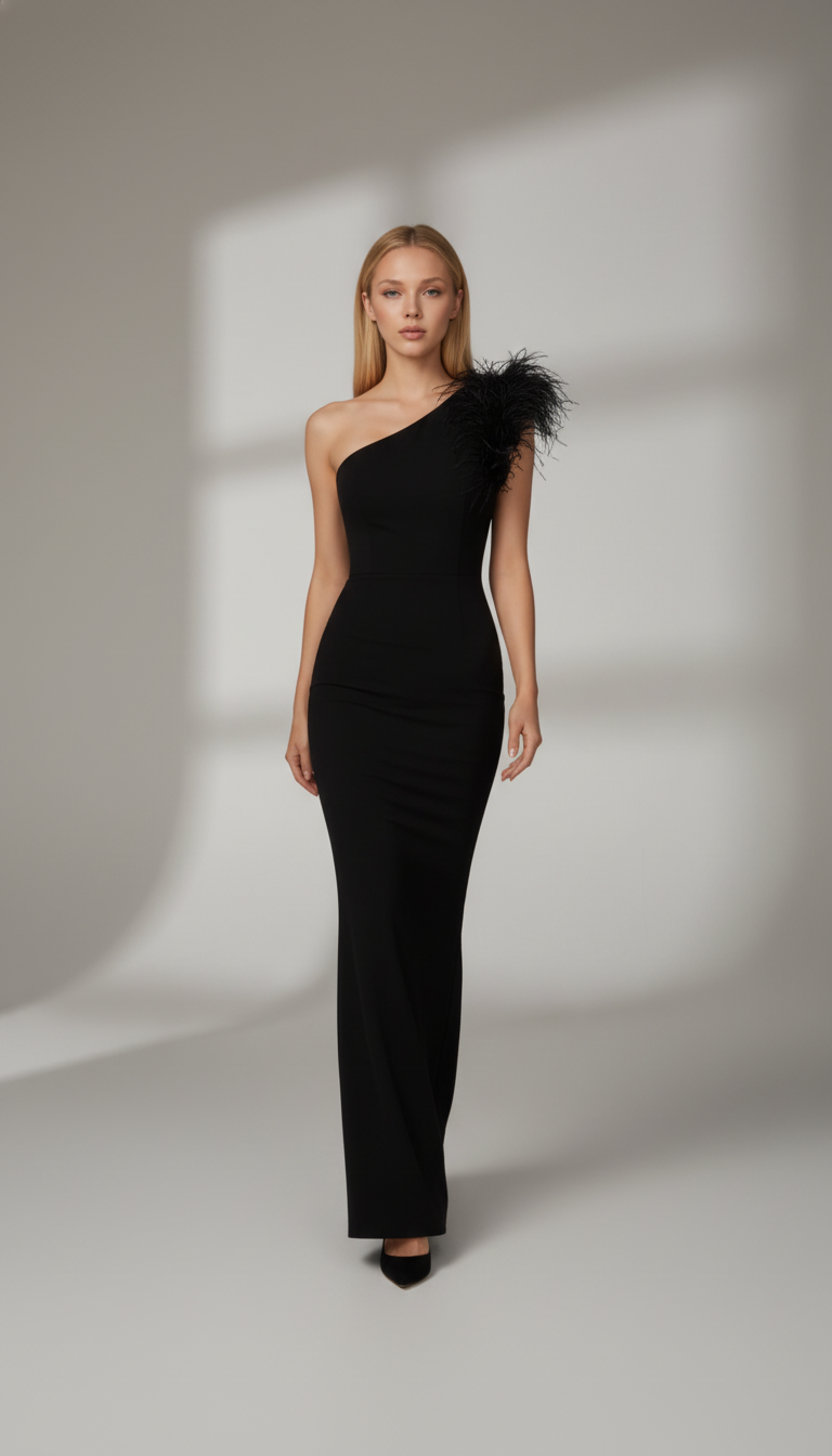 A striking black evening gown designed with a sleek, sculpted silhouette and a dramatic one-shoulder feather accent. The minimalist lines highlight feminine curves, while the feather detail adds couture-level elegance and sophistication. Perfect for galas, red-carpet events, or any occasion where timeless glamour takes center stage.