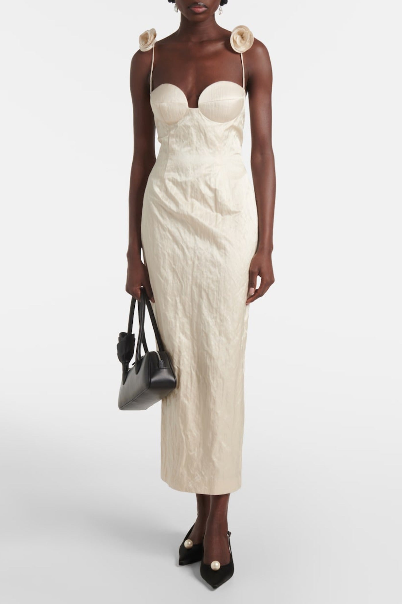 Elevate your elegance with the Durana Floral Appliqué Bustier Midi Dress in beige. This refined piece features delicate floral appliqués that enhance its sophisticated bustier silhouette, perfectly tailored to flatter your figure. The midi length adds a timeless charm, making it ideal for upscale events or special occasions where grace and style are paramount.