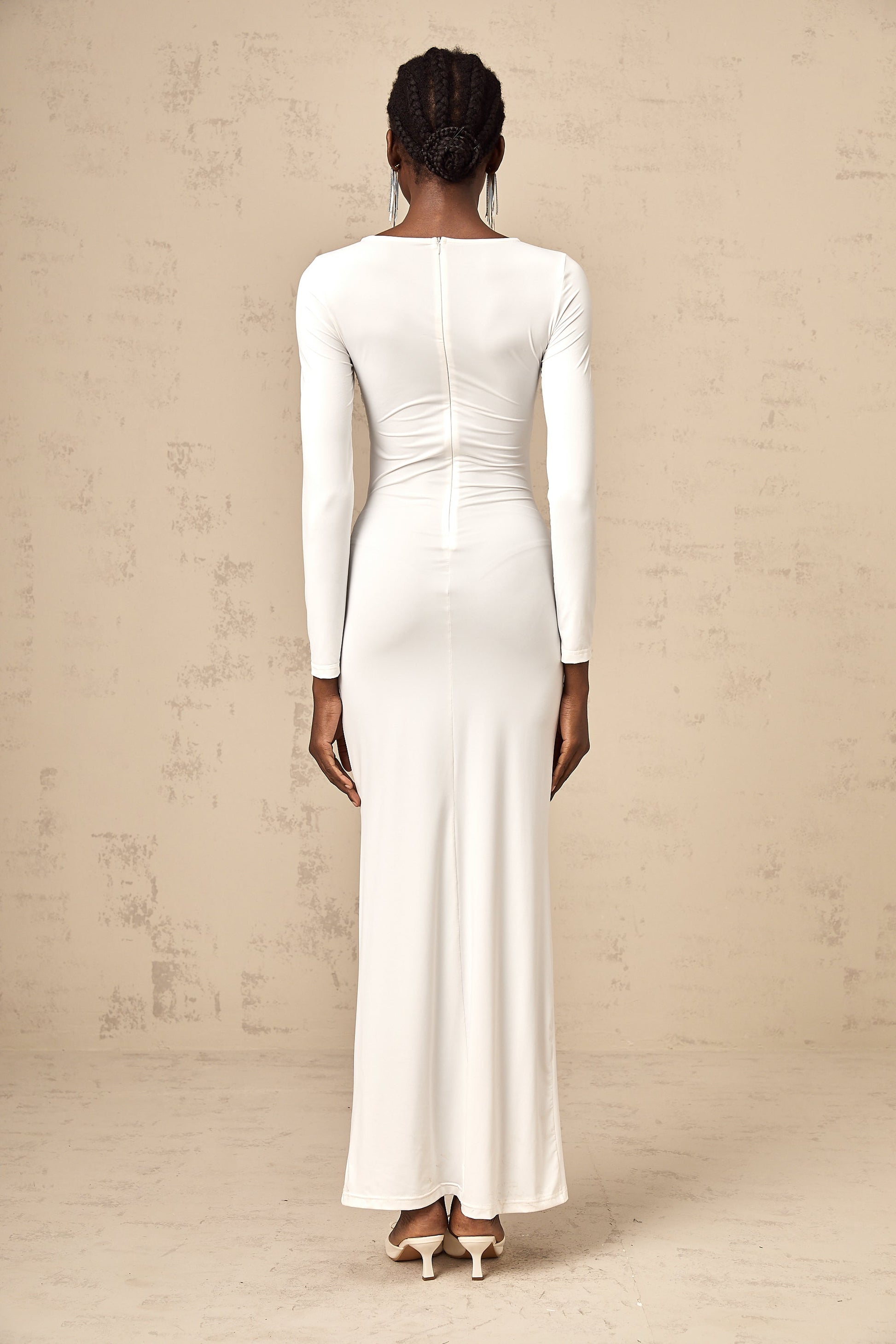 Elena white ribbon twist-detail ruched maxi dress