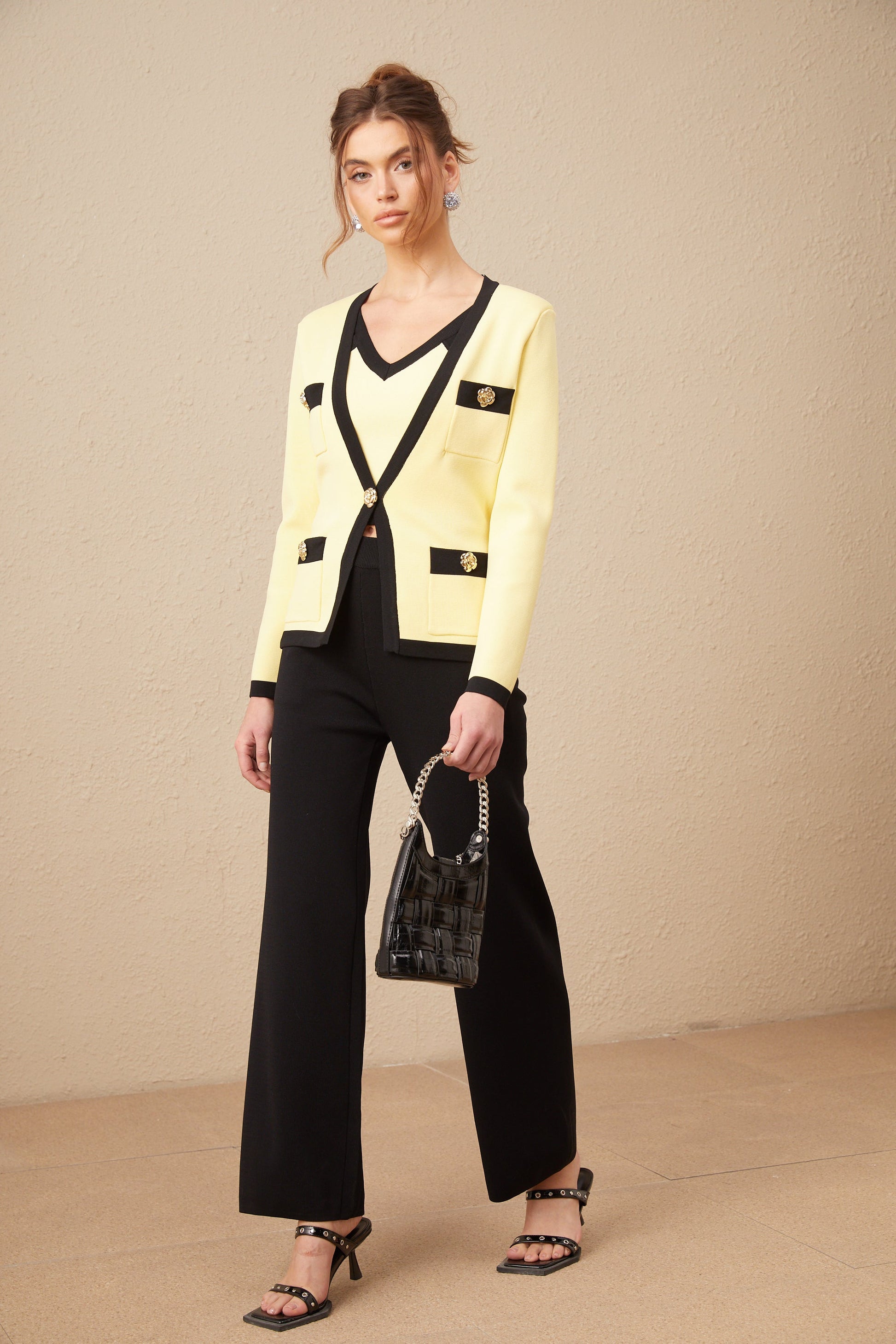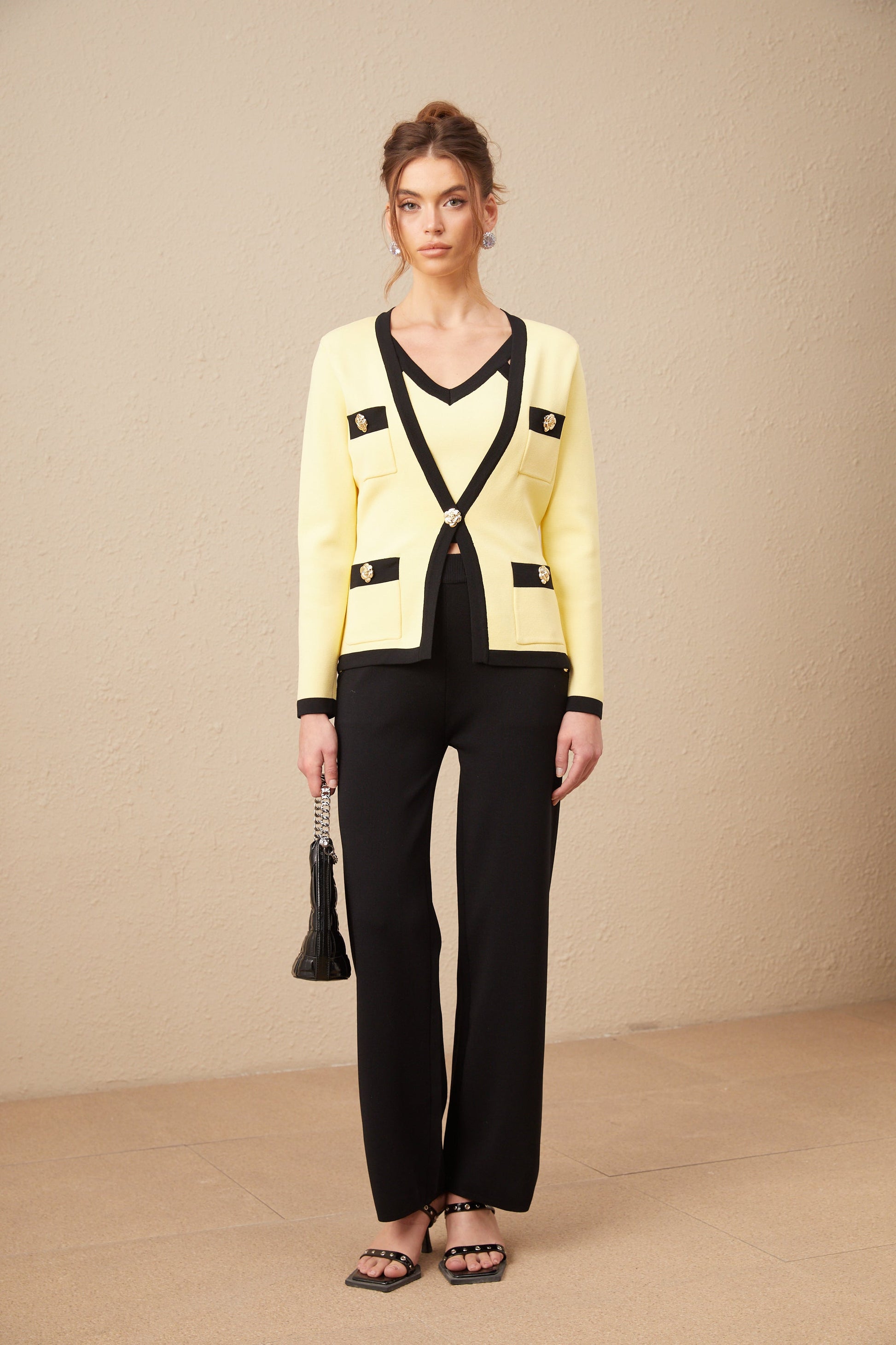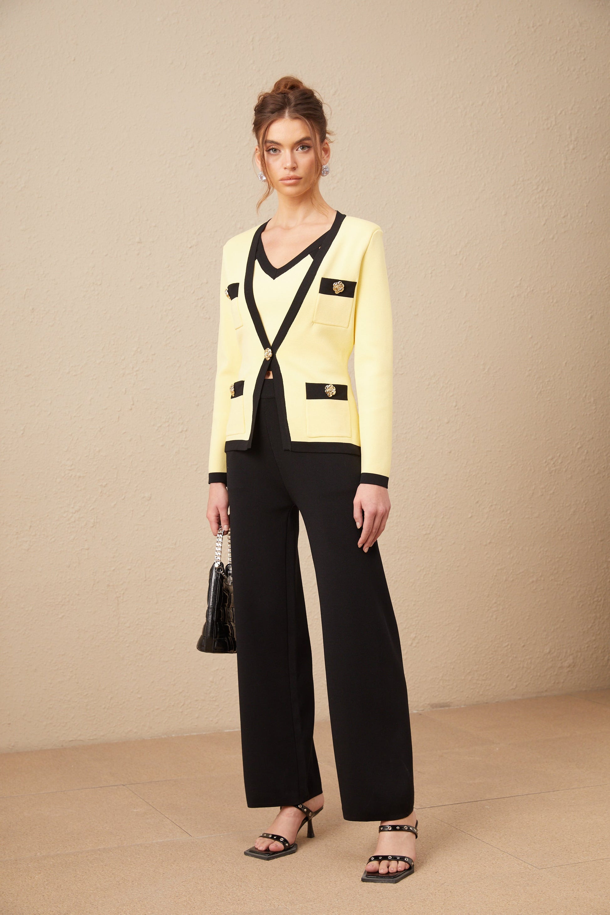 Eloise contrasting-trim knit cardigan & vest & trousers matching set
