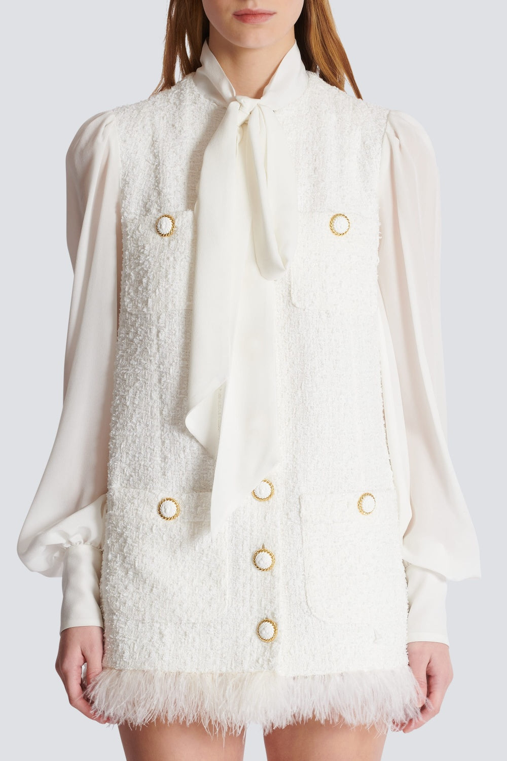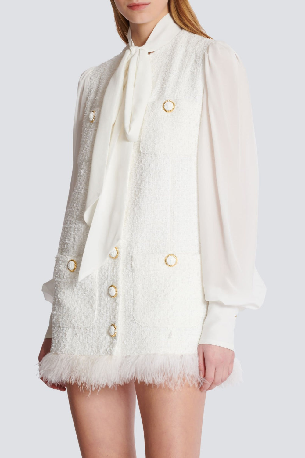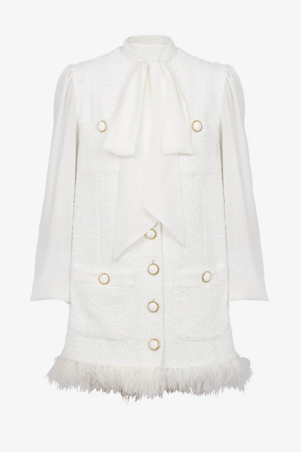 Indulge in elegance with the Enid Bow-detail Tweed Mini Dress. This luxurious dress features a classic tweed fabric and a delicate bow detail, creating a timeless and sophisticated look. Perfect for any special occasion, this dress will make you feel like a work of art.